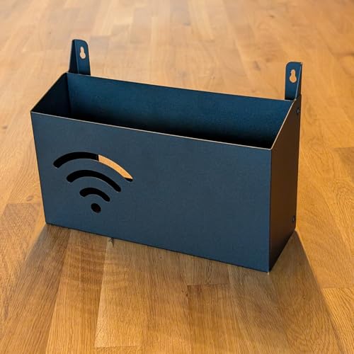 Tidy up your tech setup with the Okunaii WiFi Router Wall Mount Storage Box & Organiser in a sleek textured black finish. Whether you want to keep your router off the floor or just hide away messy cables, this storage box gives you a smart and simple way to do it. Made from durable galvanised steel, this unit is built to last. It features a modern powder-coated finish and can be either mounted on the wall or used free-standing on a desk or shelf. It arrives fully assembled and ready to use—just slot in your router or networking device, and thread the cables through the large rear cut-out for a clean, professional appearance. Thanks to the extra airflow slots at the base and front, your equipment stays cool while running, helping to prevent overheating. It’s ideal for storing routers, switches, cables, and small tech gadgets like dongles or USB drives. The compact footprint also makes it perfect for use in flats, offices, server rooms, or anywhere space is limited. Proudly made in the UK, each unit showcases expert craftsmanship and a simple design that fits right in with modern interiors. This isn’t just about storage—it’s a stylish solution for cable clutter and everyday tech management. Dimensions: Outer Height: 180mm Outer Width: 255mm Outer Depth: 95mm Internal Width: 253mm Internal Depth: 70mm Please Note: No router, cables or electronic equipment are supplied. You will receive one steel storage box only. Screws not included.