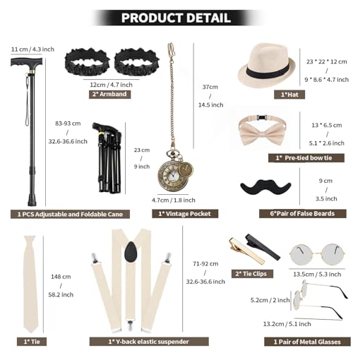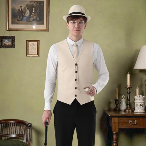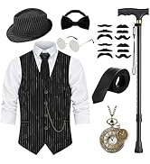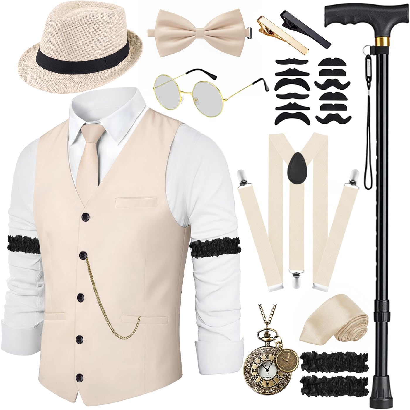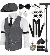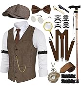 WILDPARTY 20s Costume Men's Vest with Accessories Braces, Crutch Pocket Watch Beard Beret Glasses Tie Clip for Mafia Costume 1920s Gangster Peaky Blinders Carnival Halloween Theme Party