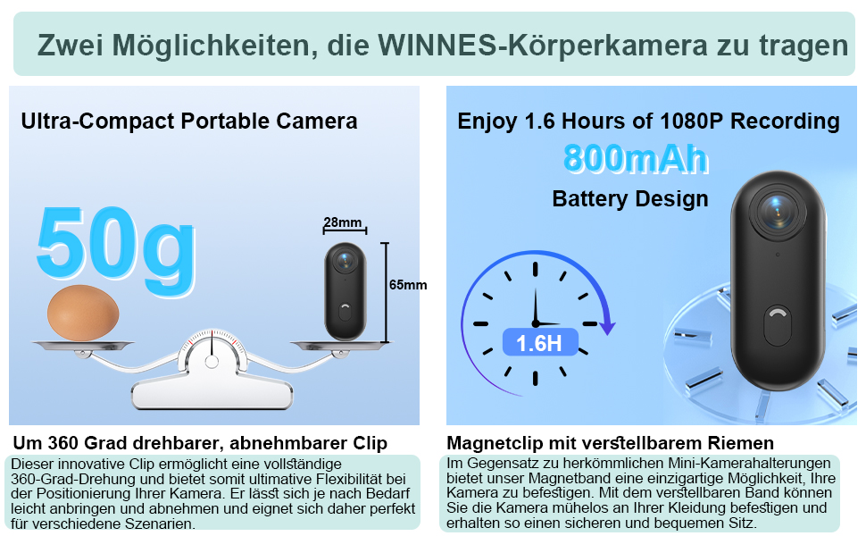 Lightweight and Mount anywhere: the weighs just 35.7 grams. It comes with a magnetic lanyard pad that lets you quickly mount it to your chest in just one second. With a 360° rotating spring clip, you can effortlessly secure the camera to your collar, pocket, waist, and more. Additionally, it includes seven other mounting accessories, making it easy to attach to bikes, motorcycles, helmets, and other gear.
