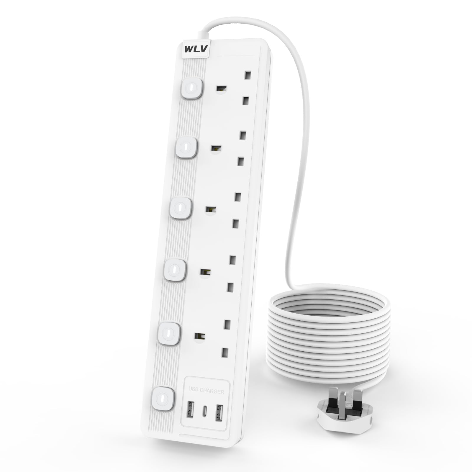 WLV 3M Extension Lead 5 Gang with 3 USB Slots, White Extension Lead with Individually Switch, Wall Mounted Power Strip for Dorm, Kitchen, Living Room, Recreation Vehicle, Bedroom