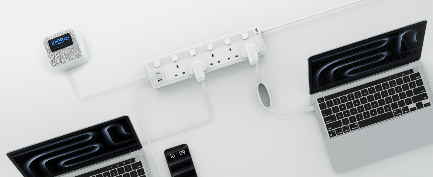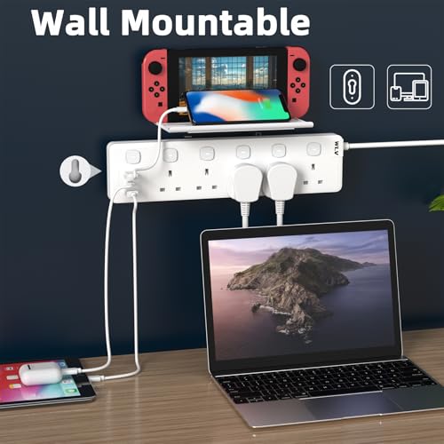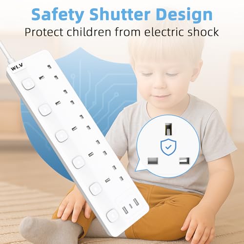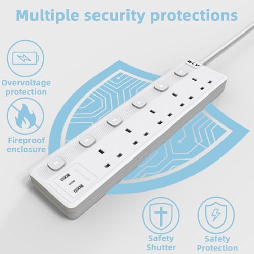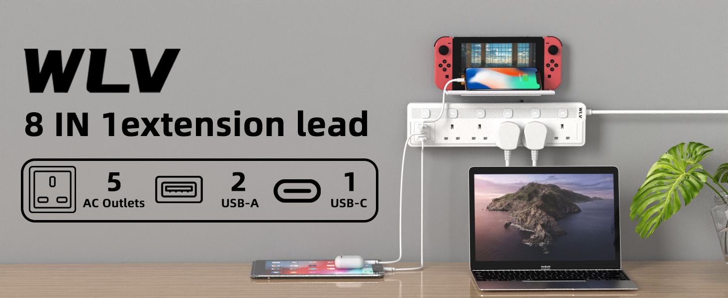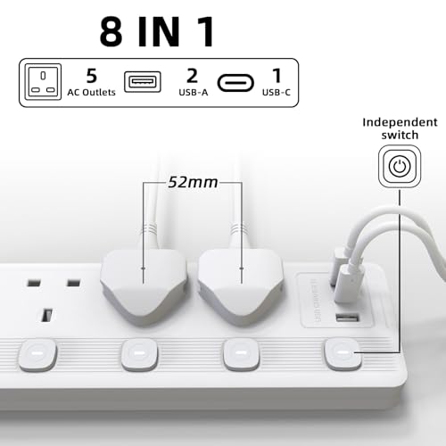 - 【5M Extension Lead】This is 5 gang extension lead with 3 usb slots, totally have 8 AC ports to charge your device. The 5m length could be applied to more usage scenarios. Kindle, Air fryer, Power bank, Electric toothbrush, Laptop, Ipad, Switch etc device could be charged. Pay attention please do not totally power more than 2500W.