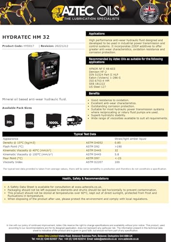 WOL-AZTEC-TOROTEC Hydratec HM 32 – High Performance Mineral Based Hydraulic Oil – Anti Wear Hydraulic Fluid – HYD017 (15L)