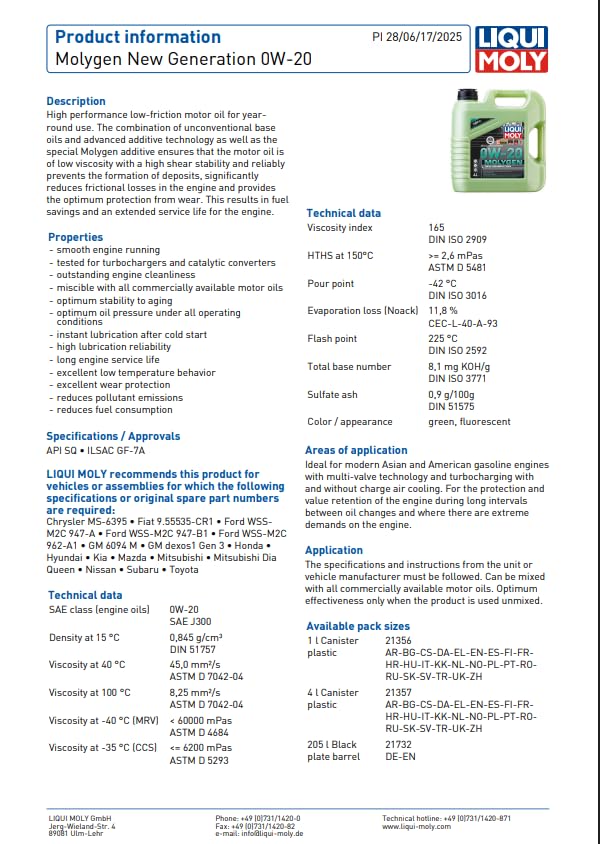 Molygen New Generation 0W-20 Oil is a high-performance anti-friction lubricant, ideal for modern vehicle engines. Thanks to its advanced additive technology and exclusive Molygen, it provides superior wear protection, reduces friction, and improves fuel efficiency, helping to reduce fuel consumption.