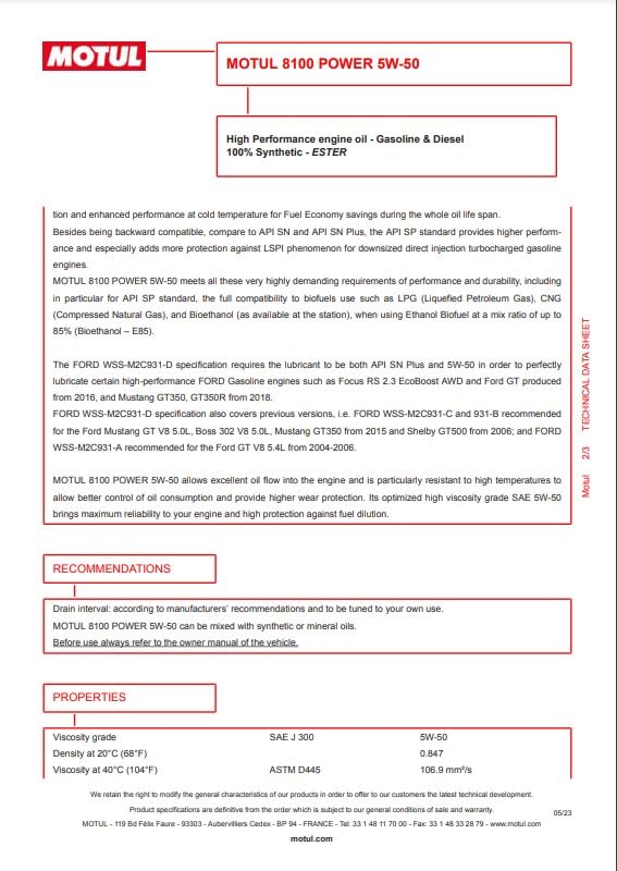 RECOMMENDATIONS Drain interval: according to owners recommendations and to be tuned to your own use. 8100 POWER 5W-50 can be mixed with synthetic or mineral oils. Before use always refer to the owner manual of the vehicle.