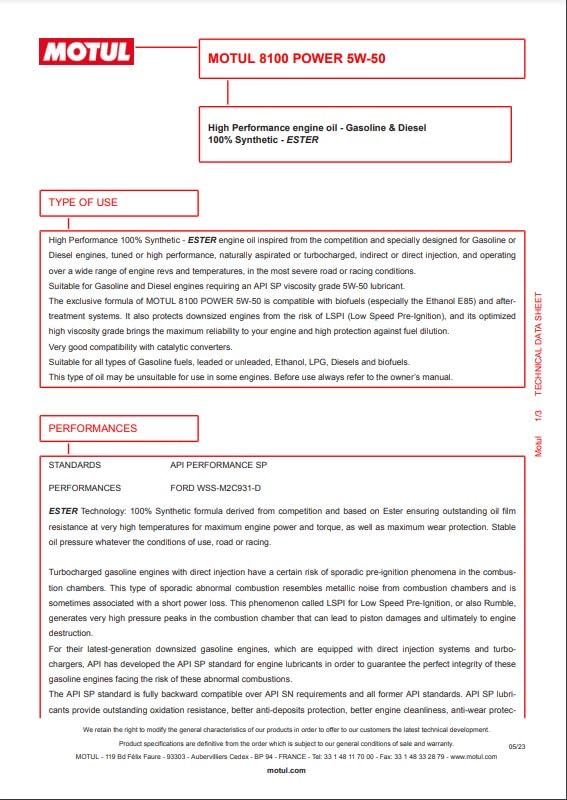 8100 Power 5W50 is high Performance 100% Synthetic – ESTER engine oil inspired from the competition and specially designed for Gasoline or Diesel engines, tuned or high performance, naturally aspirated or turbocharged, indirect or direct injection, and operating over a wide range of engine revs and temperatures, in the most severe road or racing conditions.