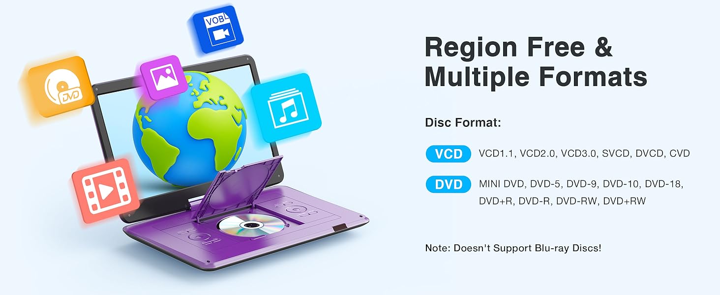【Multi-Format Support & No Regional Restrictions】This DVD video player can directly play the following formats: CD, DVD, DVD±R, CD-R(RW), SVCD-R(RW), DVD±RW, VCD (except Blu-ray). There are no regional playback restrictions, and you can enjoy wonderful movies from all over the world.