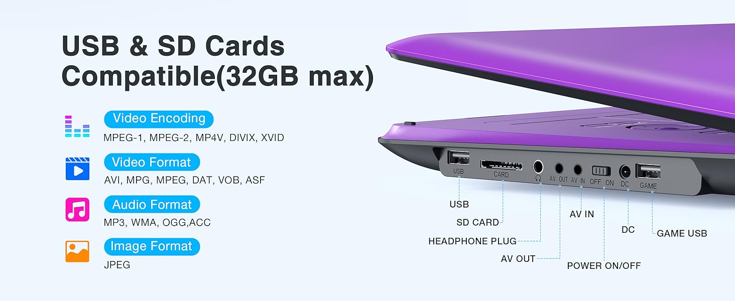 【Rich Video Interfaces & TV Screen Function】The mini DVD player supports the transfer of multimedia files such as VOB, AVI, MPEG, MP3, WMA, JPEG via USB and SD card (up to 64G). AV input/output interface can help you cast the screen to the TV, share your favorite movies, and enjoy the joy of watching DVD on a larger screen with your family. Game USB interface can help you easily enter the game moment.