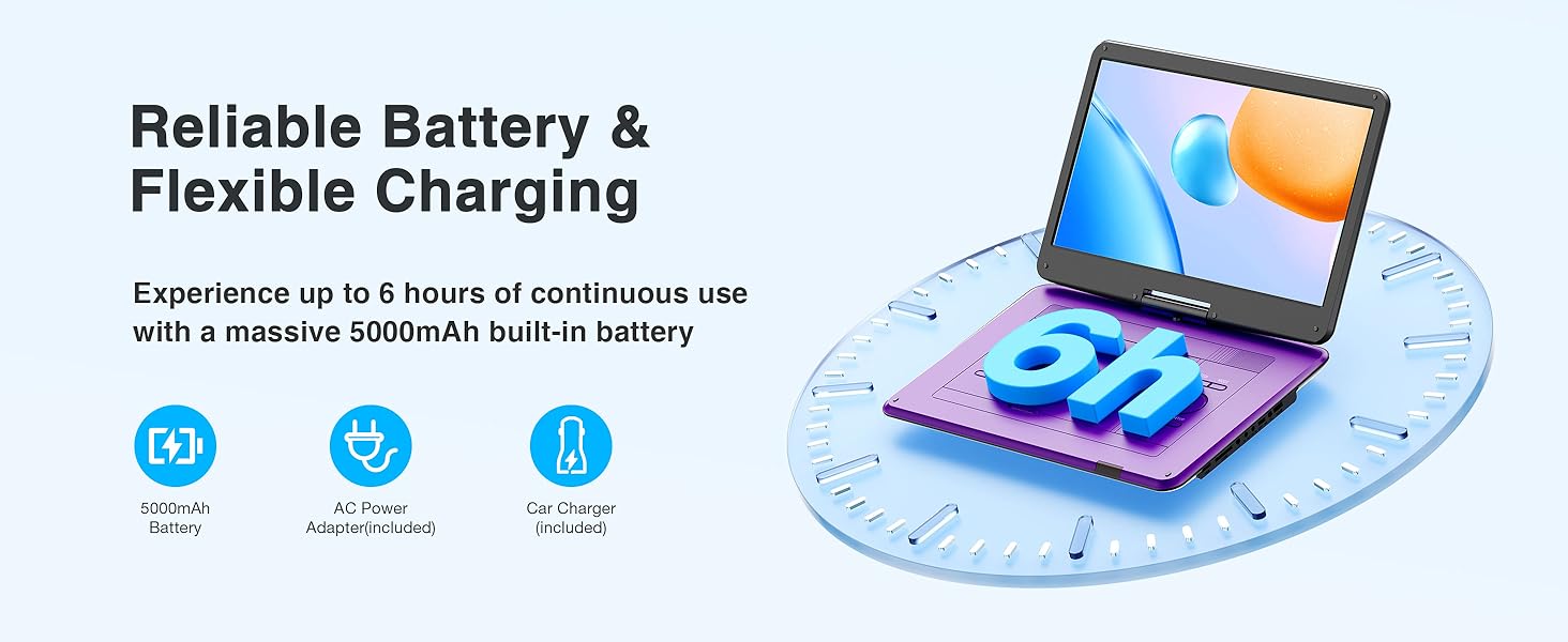 【5000mAh Larger Capacity Battery】This car DVD player has a built-in 5000mAh battery, which allows you to use it for 6 hours on a single charge. The package comes with an AC power adapter and a high-quality car charger, so you don't have to worry about running out of power. Whether you are on a train or on a self-driving tour, reliable power supply guarantees that you can enjoy your movie time.