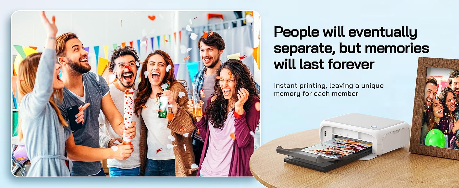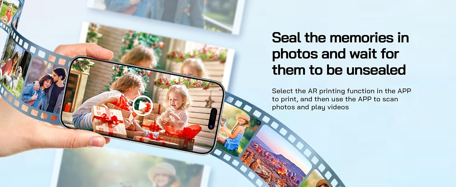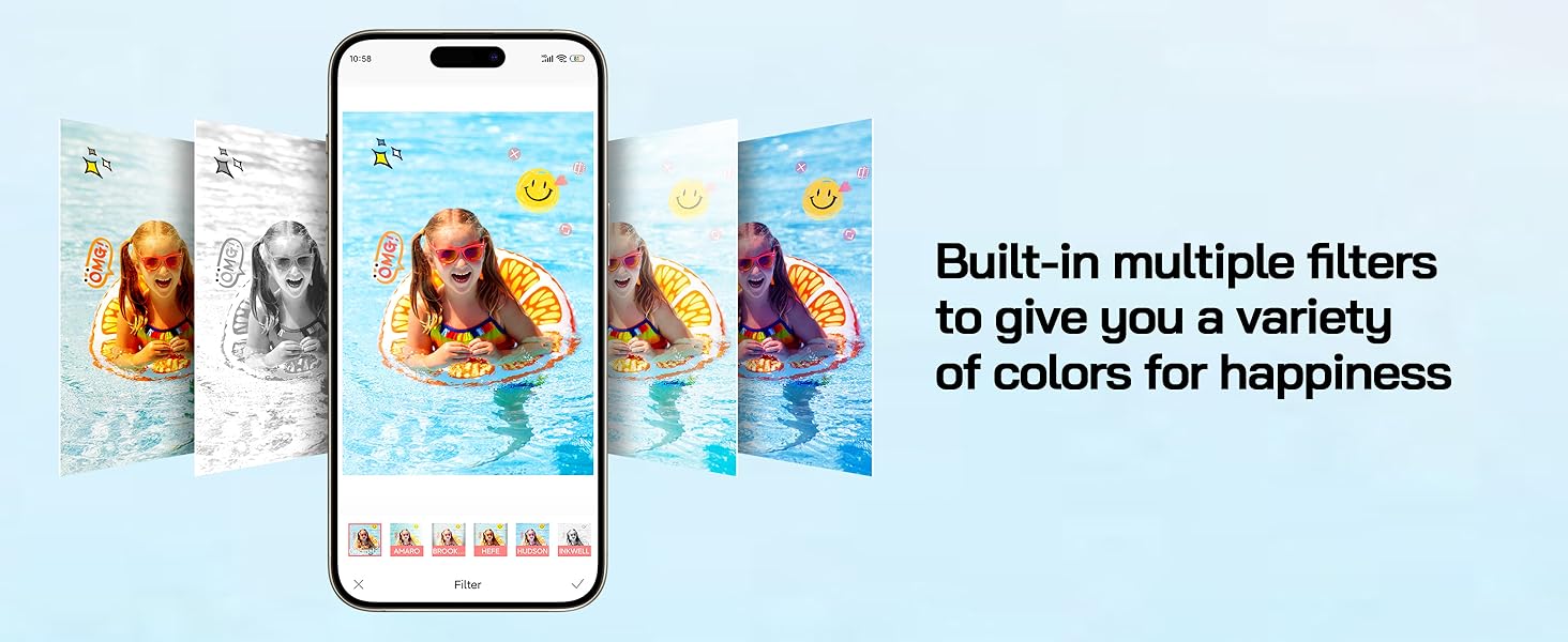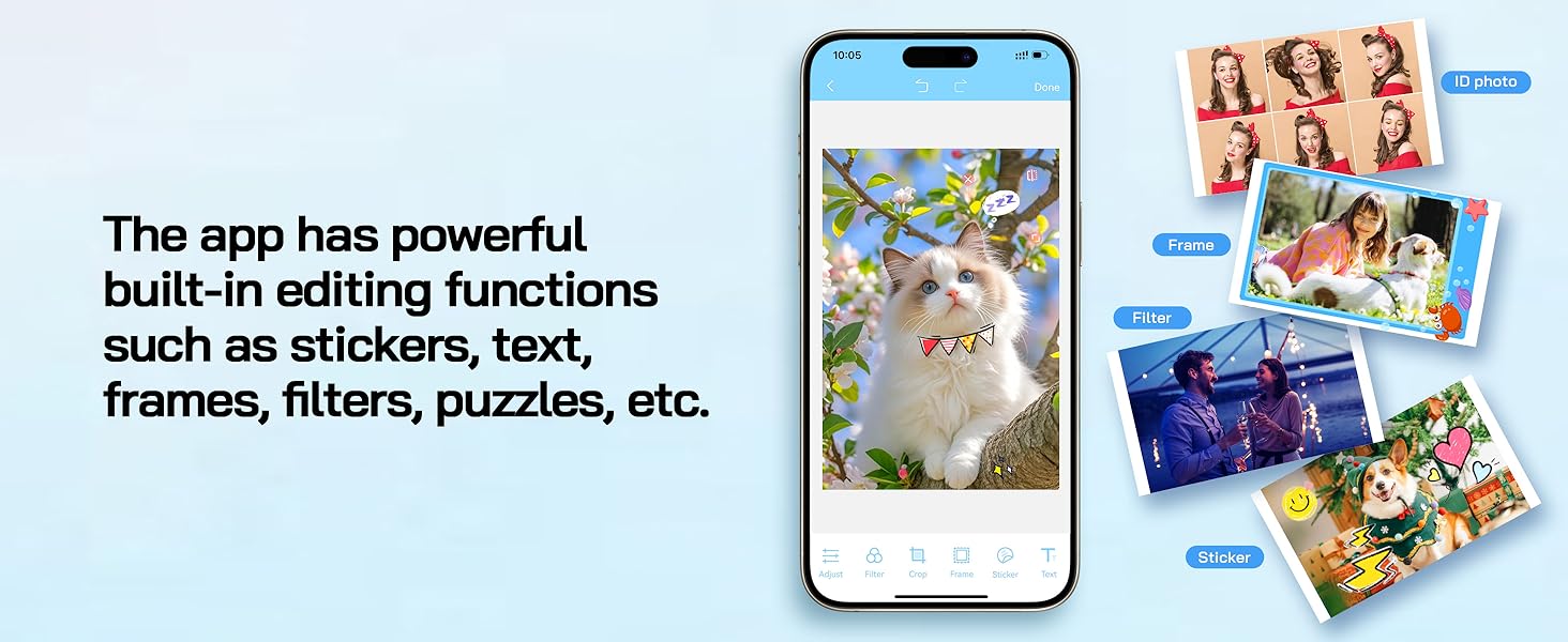 【Unique Photo Decoration Function】The exclusive APP of photo printer has a unique photo decoration function. In this APP, you can easily find a variety of stickers, frames and filters on the photo editing page. The text editing function allows you to add personalised text to your photos, whether it's a warm wish or a poetic expression, to add unique emotions and stories to your photos.