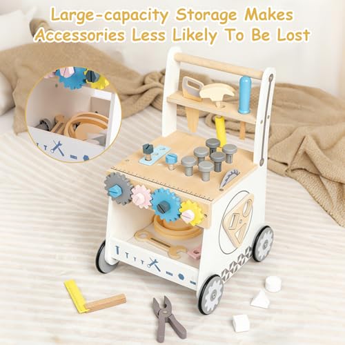 Wooden Baby Walker for Toddlers, 8-in-1 Wooden Pram Toy for 6–12 Months, Baby Activity Centre Walker with Shape Sorter, Toy Tool Set Workbench and Clock Perception, Gifts for Boys Girls