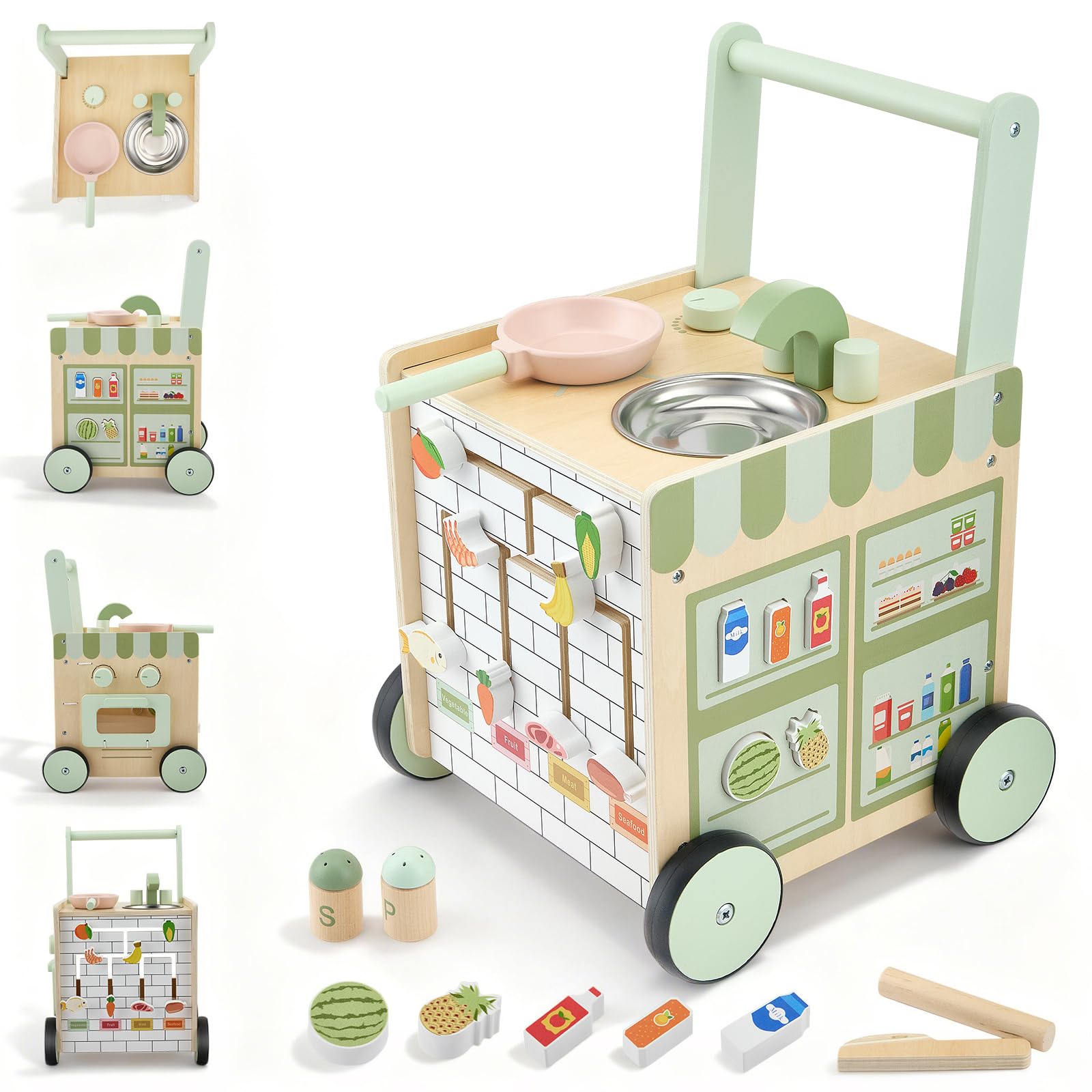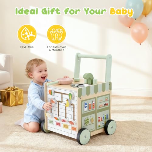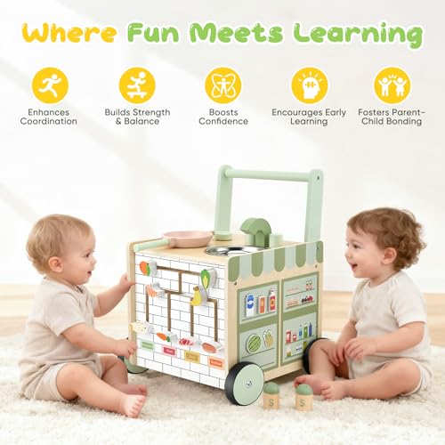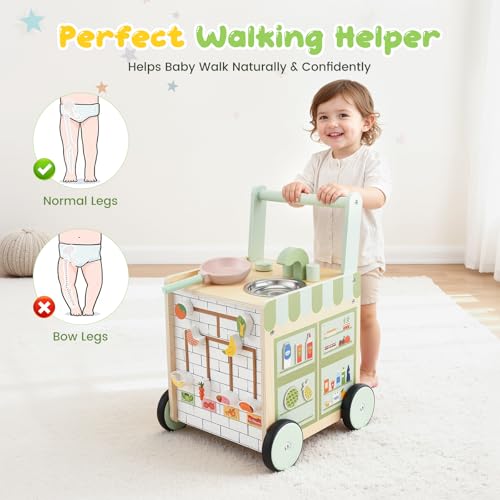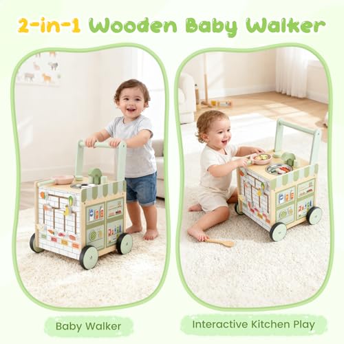 - 【5-in-1 Multi-Functional Wooden Baby Walker】 Combining walking practice, kitchen play, Montessori-inspired learning, interactive activities and cognitive development, specifically designed for infants during the crucial transition from sitting to walking. While supporting early walking, it stimulates creative thinking, enhances coordination and promotes synchronised brain and motor development