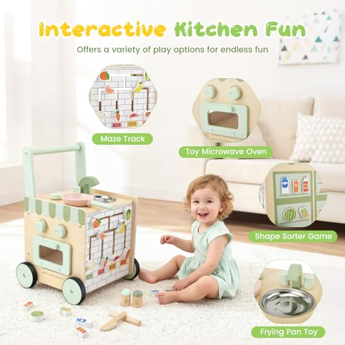 - 【Interactive Kitchen Toys】 Our wooden push along baby walker Featuring a maze slider track, toy microwave storage basket, shape sorter, and kitchen frying pan toy, this product offers boundless imaginative play. Through role-play cooking and interactive problem-solving games, children develop fine motor skills, hand-eye coordination, and creativity