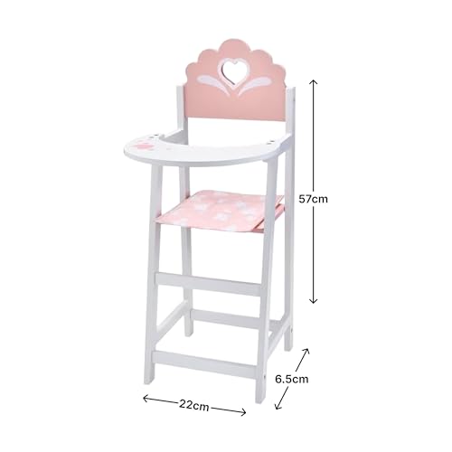 This wooden dolls highchair is designed to give children a realistic imaginative feeding experience. Made from durable MDF wood with smooth edges it includes an attached tray a shaped backrest and a soft fabric seat pad that adds comfort and charm. The highchair stands at an ideal height for most dolls allowing kids to place their toy safely and enjoy pretend meals roleplay tea parties and daily care routines. Lightweight yet sturdy it is easy to move around the playroom or nursery making it suitable for regular interactive use. The soft removable fabric cushion features a gentle pastel pattern and can be wiped clean to maintain hygienic play. With dimensions approximately forty eight centimetres tall twenty four centimetres wide and twenty four centimetres deep the chair fits comfortably on shelves or small play areas while offering stable support. Its construction promotes creative storytelling nurturing skills and emotional development in young children. A thoughtful accessory for doll collections this wooden chair makes a charming gift for birthdays Christmas or imaginative play sessions encouraging children to develop responsibility confidence and pretend parenting skills.