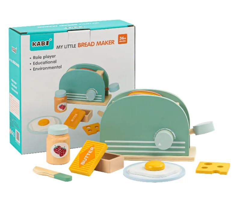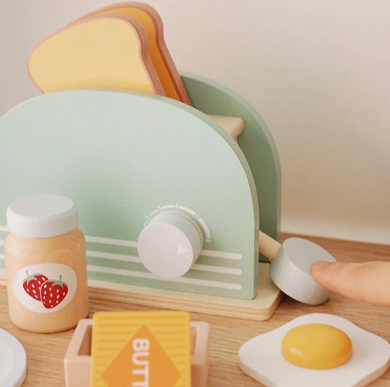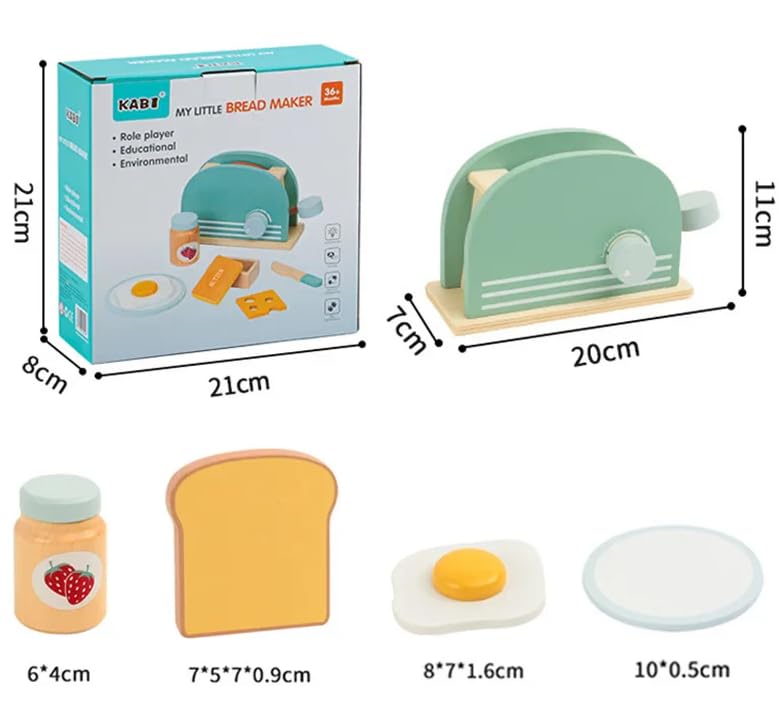 - REALISTIC WOODEN TOASTER SET FOR KIDS This beautifully crafted Montessori wooden toaster toy includes a pop-up toaster, toast slices, butter, cheese, egg, plate, knife and jam jar. Perfect for pretend play kitchen sets and imaginative learning.