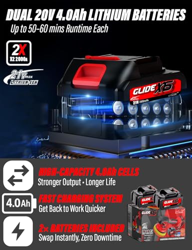 - 【DUAL 21 V 4.0 Ah BATTERIES = EXTENDED RUNTIME】Includes two heavy-duty 4.0 Ah lithium batteries and rapid charger. Each battery provides up to 50–60 minutes of continuous use; swap instantly for all-day detailing freedom with zero downtime.