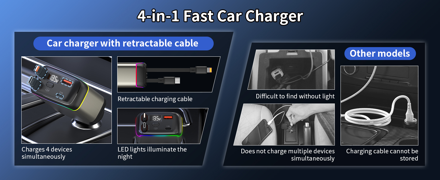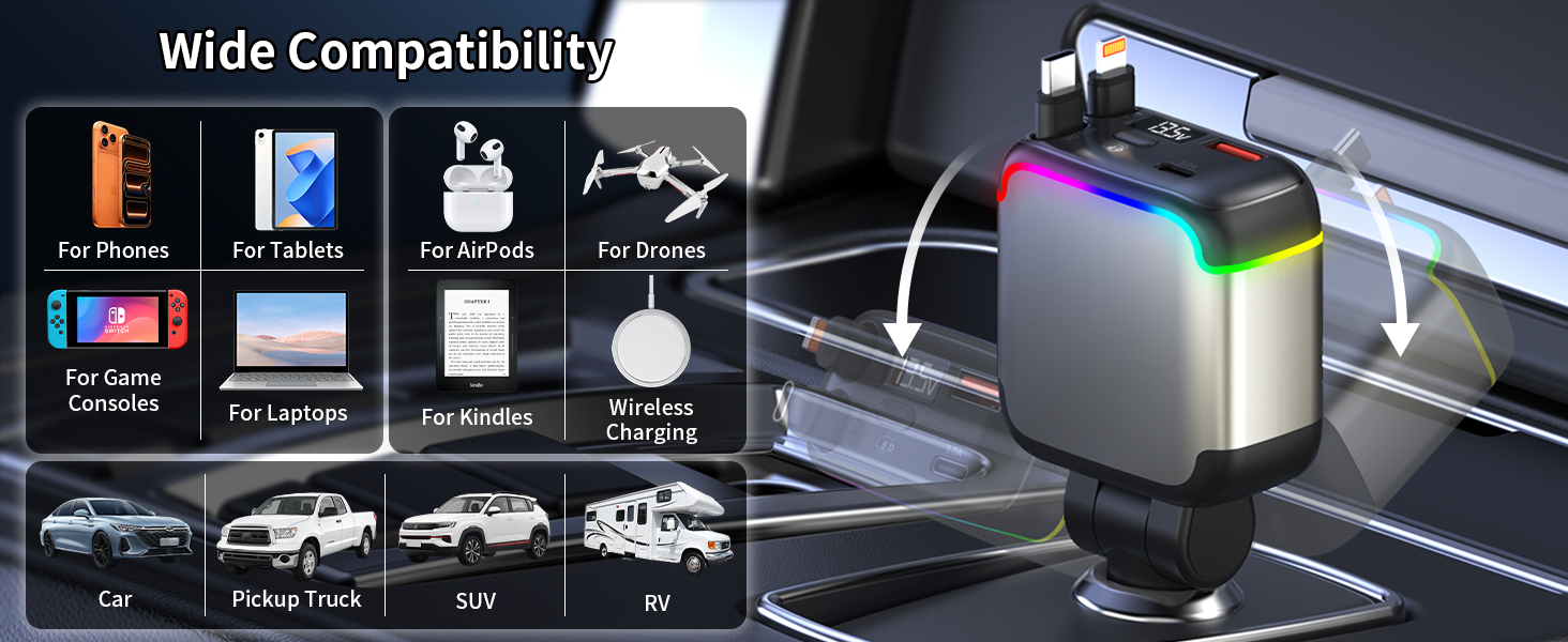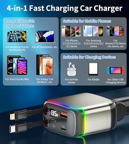 - 【Wide Compatibility】 The car charger adapt supports multiple fast charging protocols, including PD3.1, QC3.0, SCP, FCP, AFC, PPS, and BC1.2; and the 4 connectors(2 retractable cable, USB-A, USB-C) are compatible with iPhone 17/16/15/14/13/12 series, Samsung Galaxy S25/S24/S23/S22/S21, Xiaomi, Huawei, Motorola, LG, Pixel 9/8/7 other phones, for laptops like MacBook Pro, Surface Pro, Chromebook, for tablets like iPad Pro, and USB devices like smartwatches and headphones.
