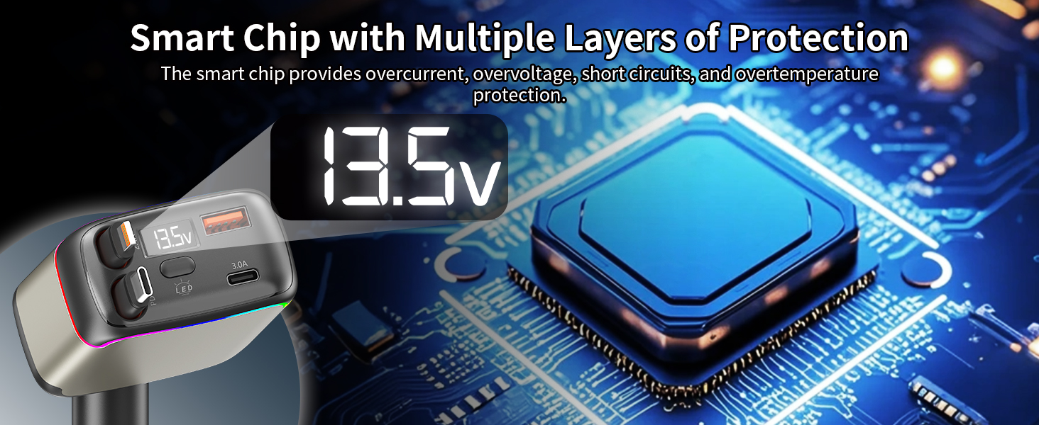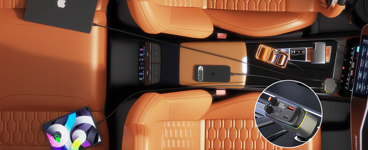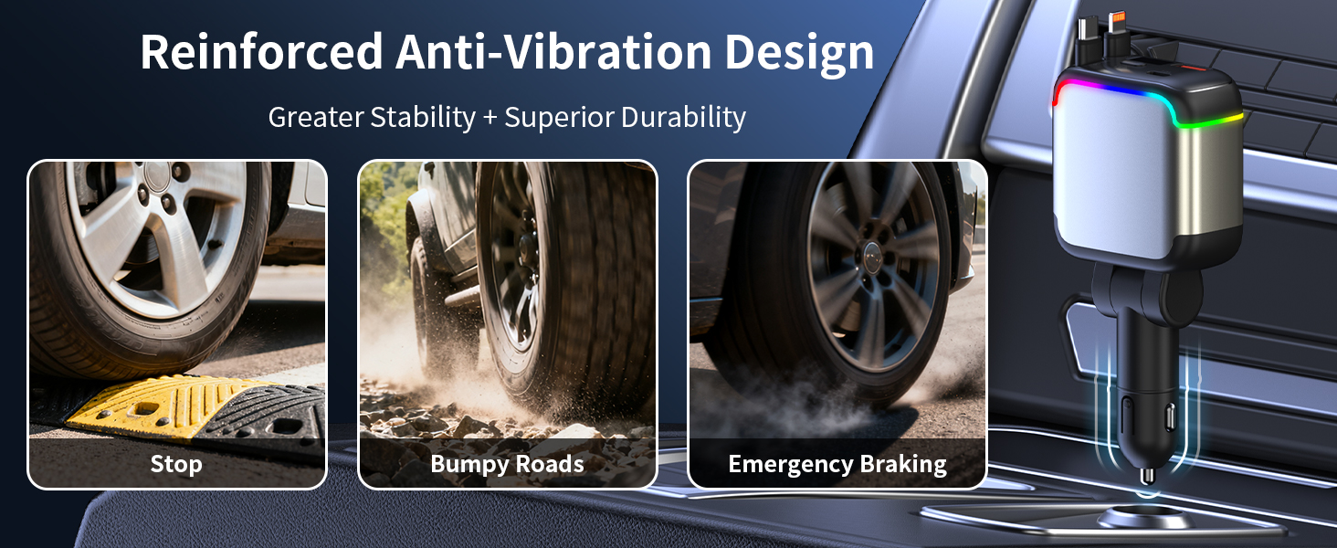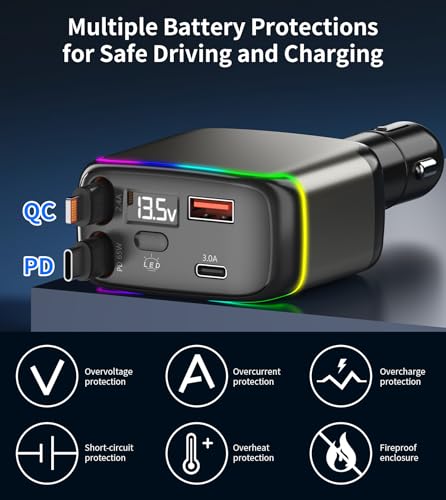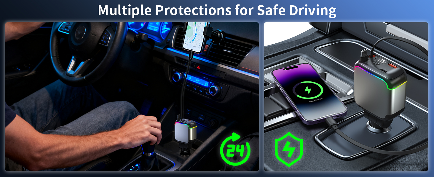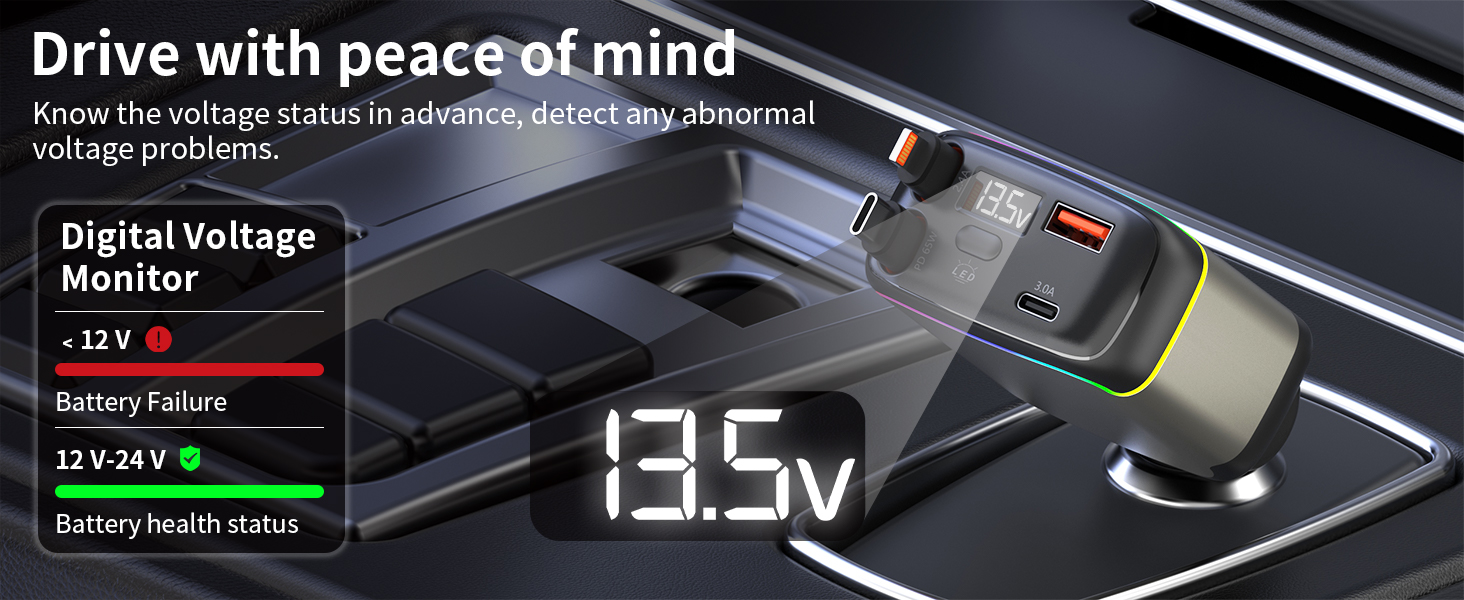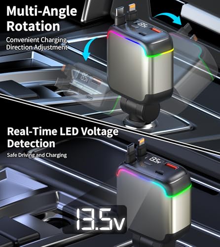 - 【Real-Time Voltage Monitoring & Stable charging】This retractable usb c car charge is equipped with an LED display that can monitor the voltage in real time. The colorful ambient light allows for precise operation even in dark environments. The reinforced metal contact design at the bottom ensures a secure connection without vibration interference. Even on bumpy roads, potholes, or during sudden braking, charging remains stable.