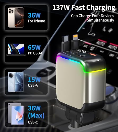 XXZU 137W Retractable Car Charger,4-in-1 USB Car Charger Adapter,Fast Charging with 2 Cables+USB-C+USB-A,4-Port Car Accessories Compatible with iPhone17/16/15/14/13/12/iPad/MacBook,iPad,Android,Laptop