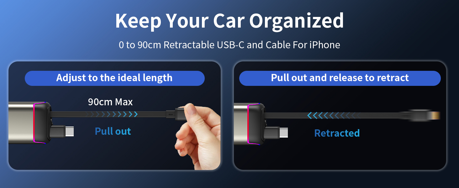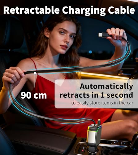 - 【Retractable Charging Cable & 180°Adjustable Angle】 This fast charging car charger includes two built-in retractable cables which extend up to 90cm for convenient charging in the backseat. Pull the cable to the appropriate length to charge your device. Carefully pull it out again and the cable will retract automatically. What's more, the car charger's 180°rotating design can adapt to various car spaces, thus avoiding collisions with surrounding objects such as gear shift levers or cup holders, while keeping your car clean and preventing wear and tear.(Note: Leave enough space around the cigarette lighter for optimal use.)