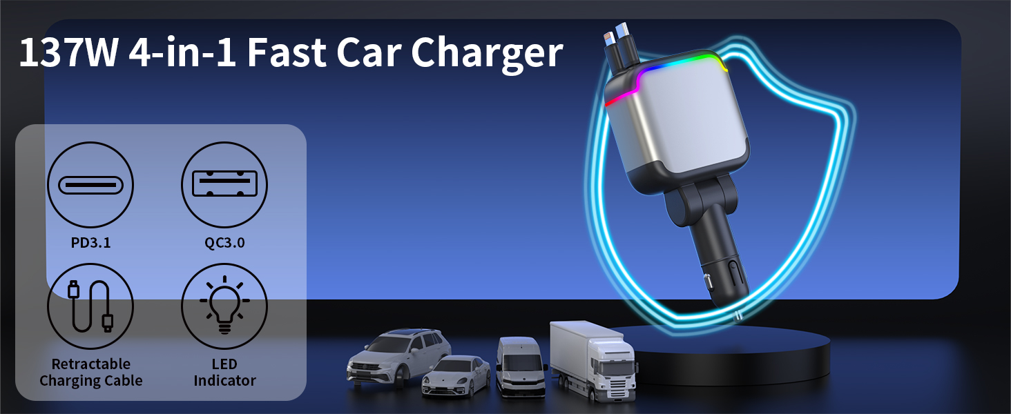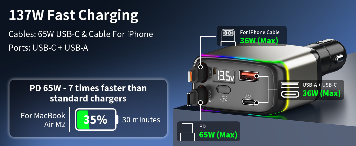 - 【137W High-Power Fast Car Charger】 This retractable car charger has 4 ports which can provide a total of 137W high-power fast charging, ideal for laptops, smartphones, tablets, GPS, driving recorders and more. It's compatible with all USB-C and USB-A devices and suitable for sedans, RVs, SUVs, vans, trucks and all 12V to 24V vehicles, meeting your charging needs for all commonly used devices in the car.