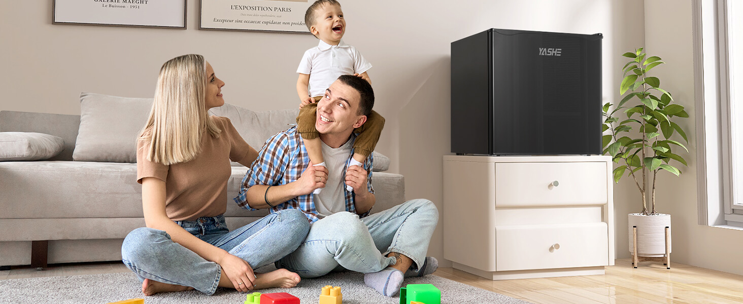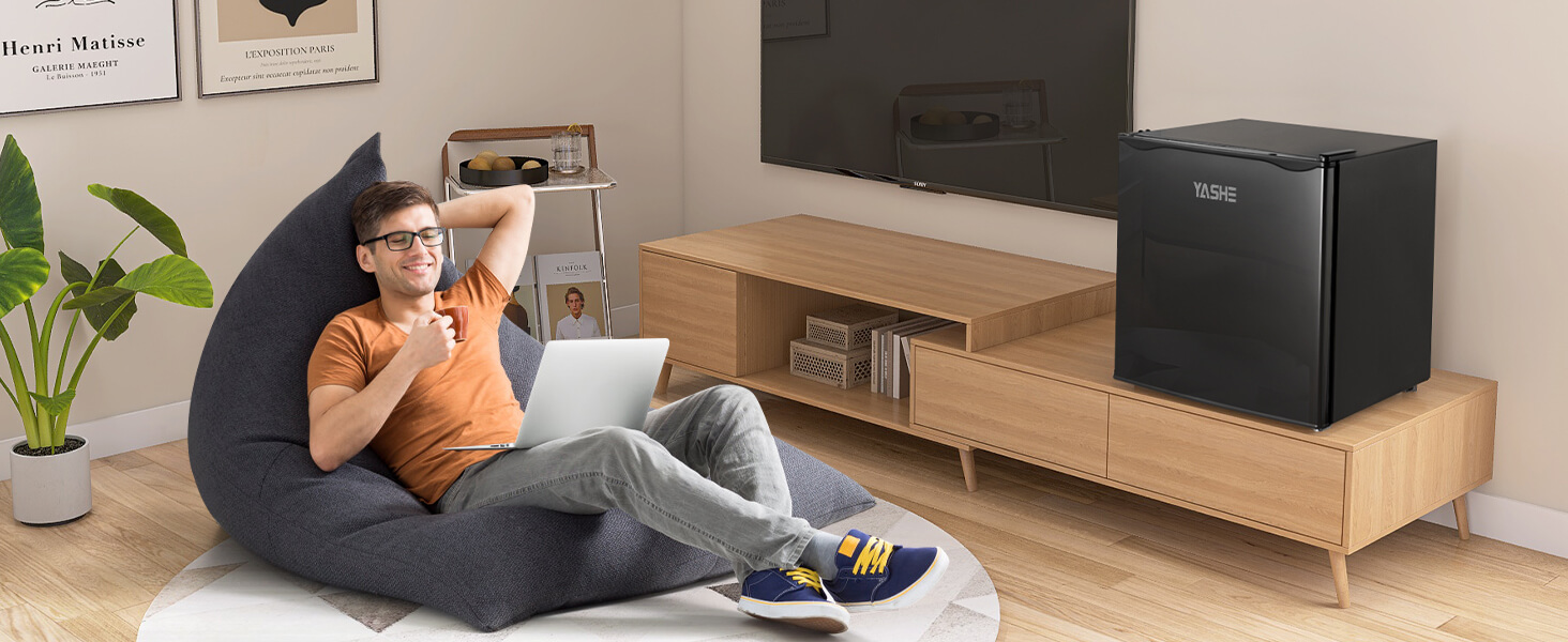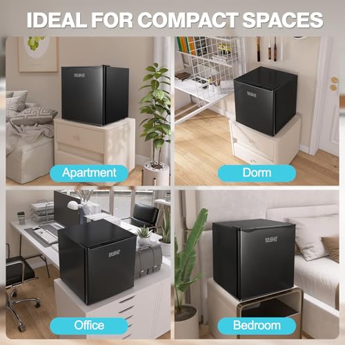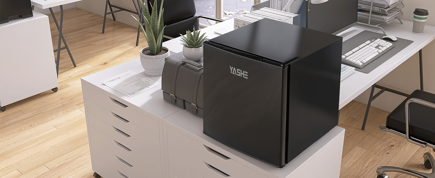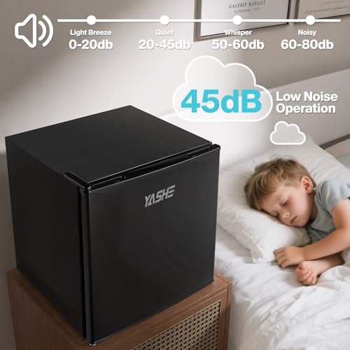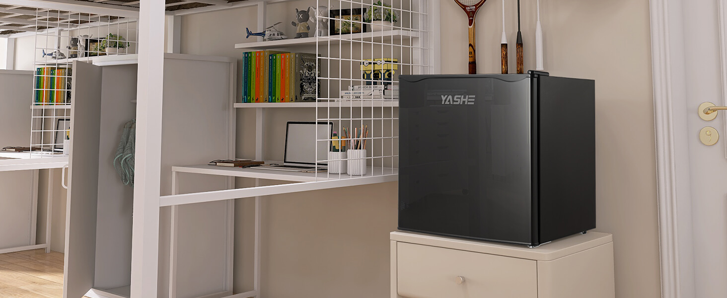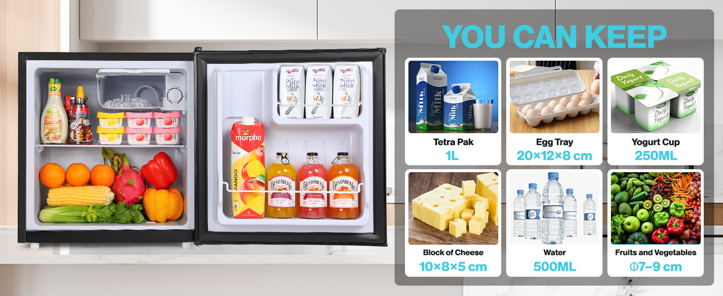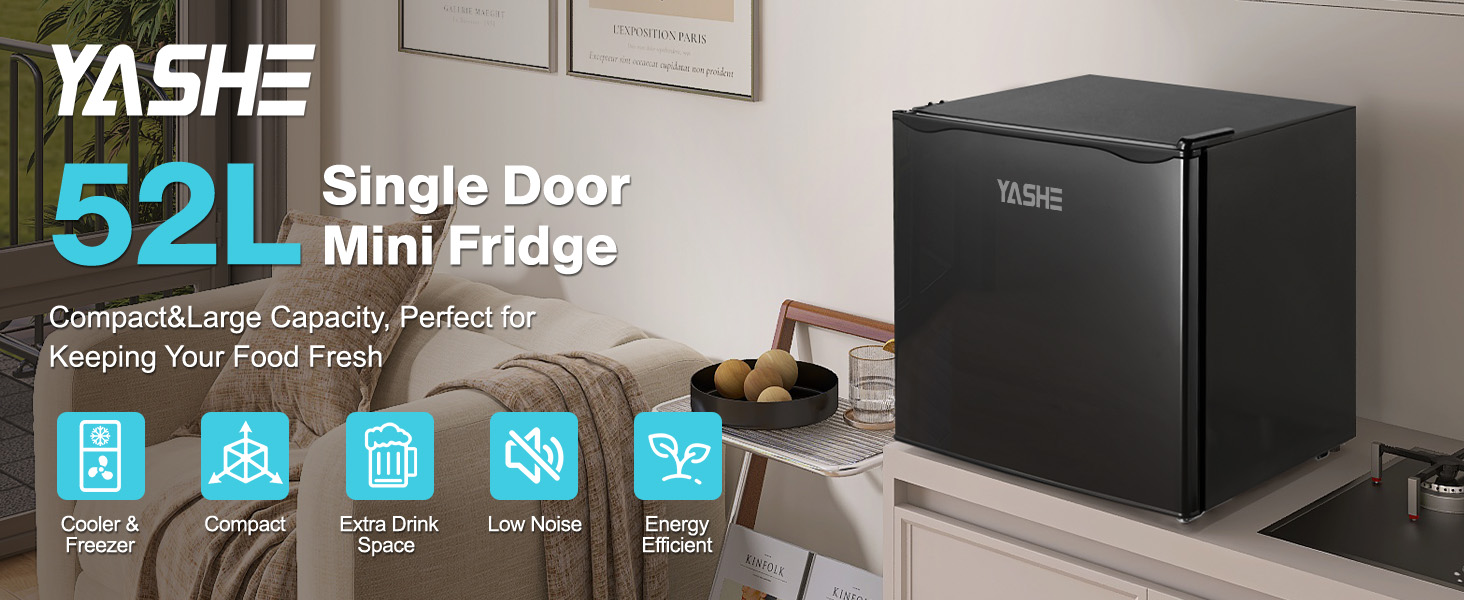 52L Capacity: The YASHE mini fridge measures 47*44.5*50.6CM (W x D x H) and offers a 47L internal capacity. The single-door design maximizes space efficiency, allowing easy access to both ice cubes and drinks. Its compact size and smart design make it ideal for dorms, offices, bedrooms, RVs, garages, guest rooms, college spaces, trucks, and even small counter areas