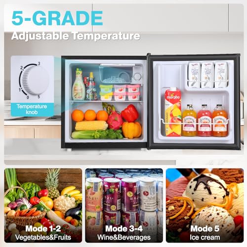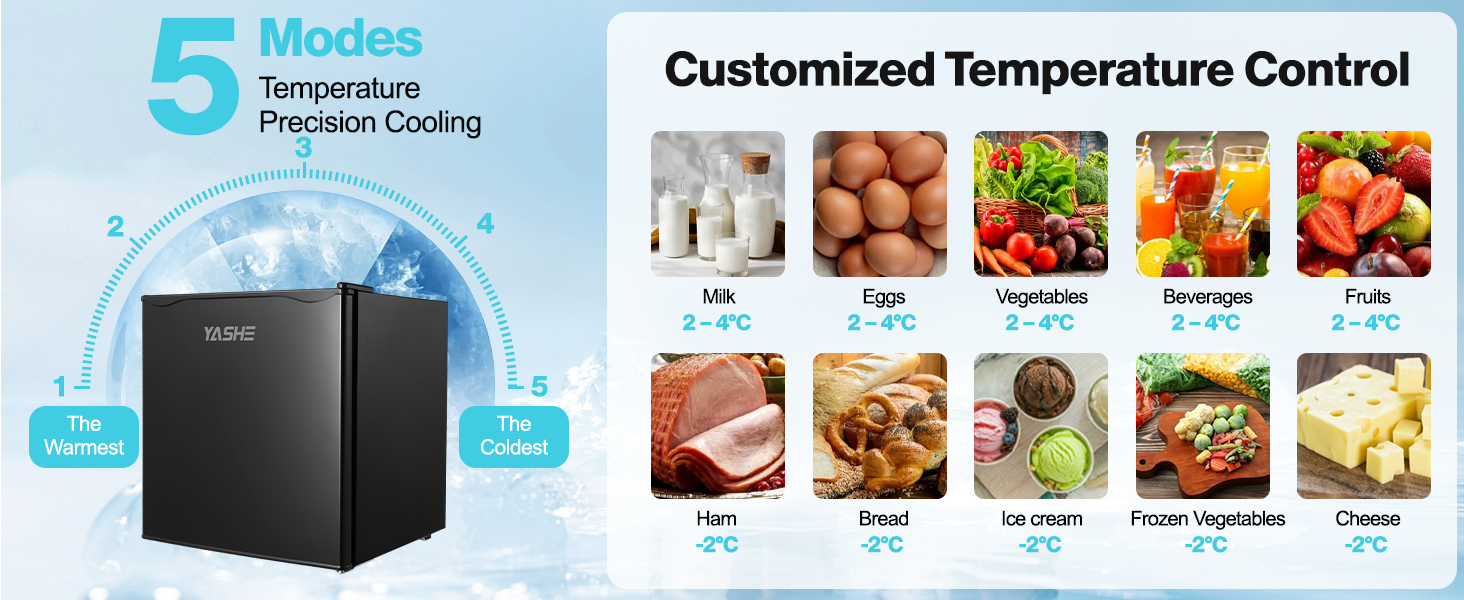 Adjustable Thermostat: With a range from 28.4° F to 35.6° F (-2°C to 2°C), this mini refrigerator for bedroom or office offers 5 adjustable temperature settings to suit your needs throughout the year. Whether storing beverages in the summer heat or keeping perishable items fresh in cooler weather, you can select the ideal temperature. The optimum temperature range for perishable food storage is 37-41°F (3-5°C). The freezer temperature will adjust based on the overall fridge settings