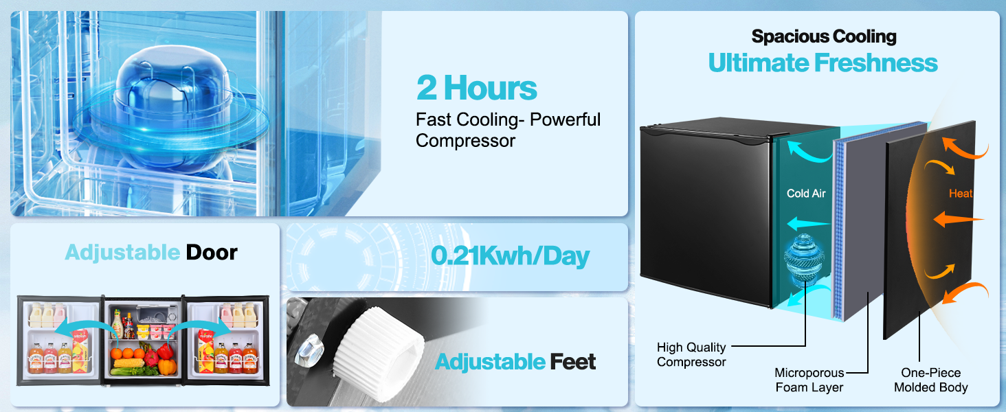 Reversible Door: This portable refrigerator comes with a reversible door that can be easily adjusted to open from either the right or left side. This customizable feature allows you to choose the most convenient door orientation based on your room layout, providing flexibility in tight spaces and ensuring seamless integration into your home, college, or office setup