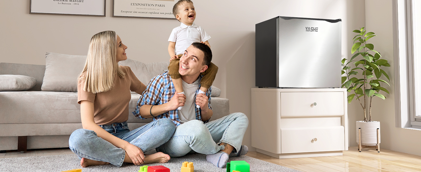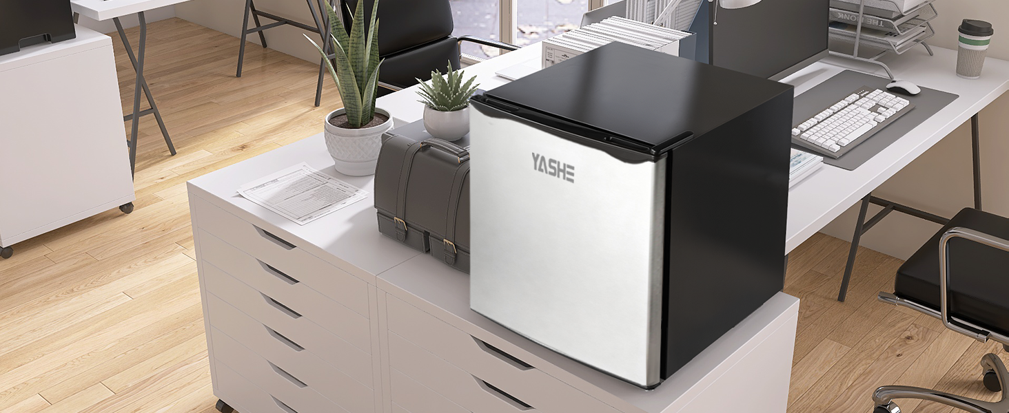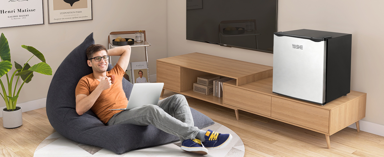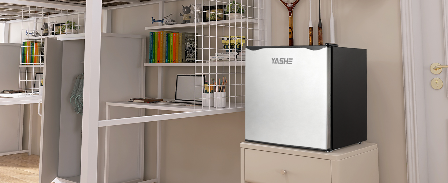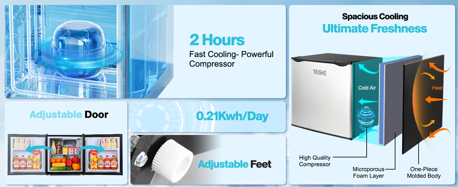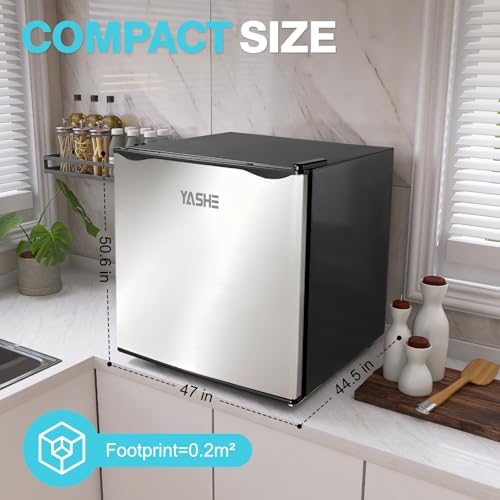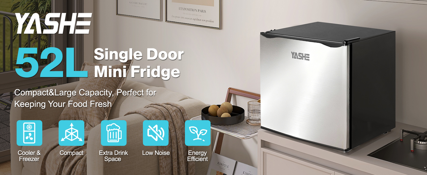 52L Capacity: The YASHE mini fridge measures 47*44.5*50.6CM (W x D x H) and offers a 47L internal capacity. The single-door design maximizes space efficiency, allowing easy access to both ice cubes and drinks. Its compact size and smart design make it ideal for dorms, offices, bedrooms, RVs, garages, guest rooms, college spaces, trucks, and even small counter areas