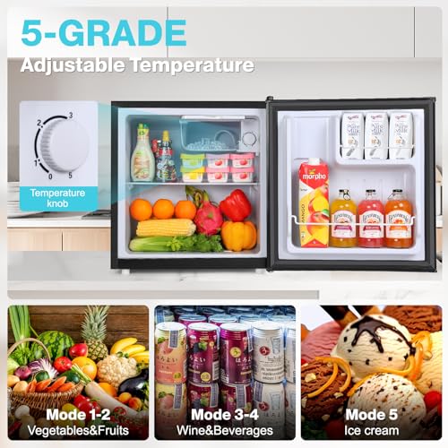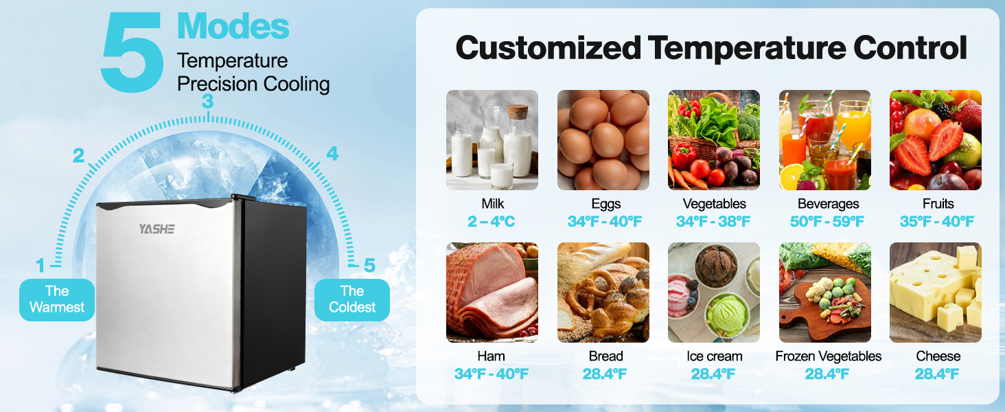 Adjustable Thermostat: With a range from 28.4° F to 35.6° F (-2°C to 2°C), this mini refrigerator for bedroom or office offers 5 adjustable temperature settings to suit your needs throughout the year. Whether storing beverages in the summer heat or keeping perishable items fresh in cooler weather, you can select the ideal temperature. The optimum temperature range for perishable food storage is 37-41°F (3-5°C). The freezer temperature will adjust based on the overall fridge settings