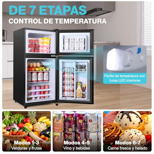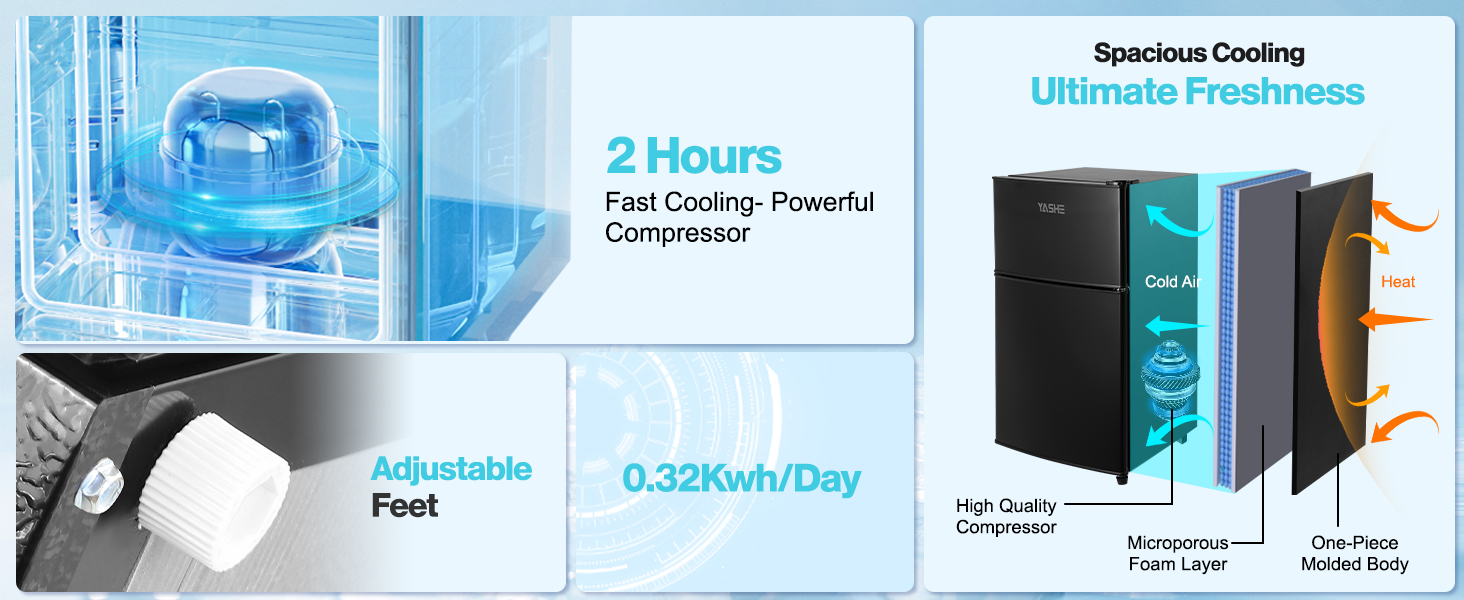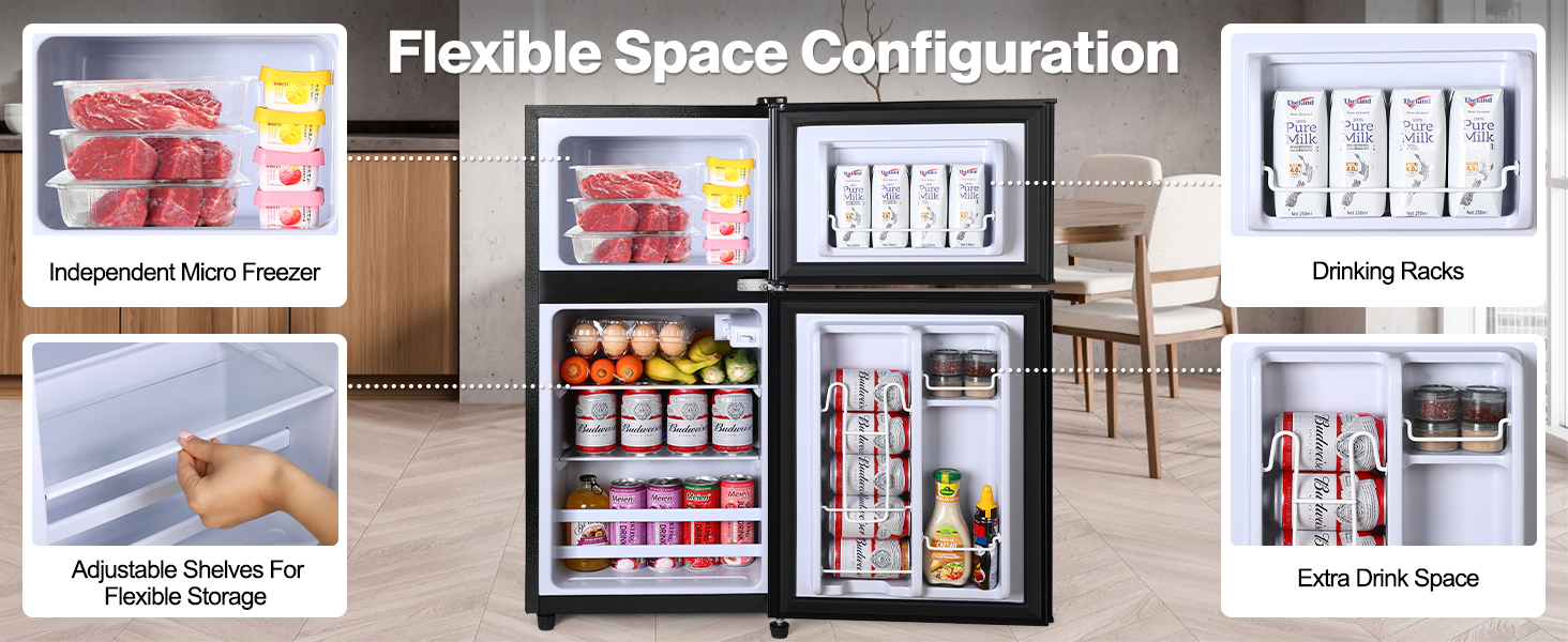Flexible Storage Configuration: This small fridge is equipped with adjustable shelves and a removable storage compartment, allowing you to customize the interior to your needs. For example, you can adjust the shelves to accommodate large bottles or pizza boxes, while the removable compartment accommodates larger items like frozen dishes or bulk groceries. Whether you store drinks, snacks or leftovers, its flexible configuration allows you to maximize storage space and organize everything, making it ideal for meeting different needs throughout the week