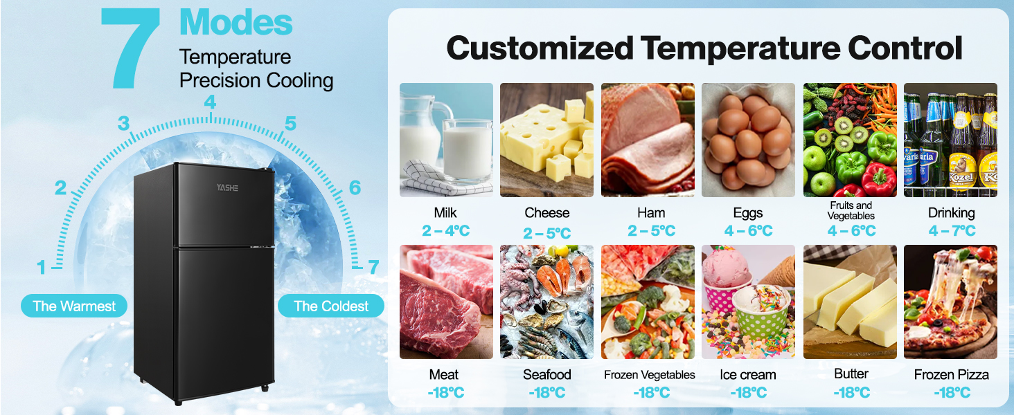 Adjustable Thermostat: With a temperature range of -18°C to 5°C, this mini fridge for bedroom or office offers 7 temperature settings to suit your needs all year round. Whether for storing drinks during summer heat or storing perishable food in cool weather, you can choose the ideal temperature. The optimum temperature range for storing perishable foodstuffs is 3-5 ° C. Freezer temperature adjusts according to general refrigerator settings
