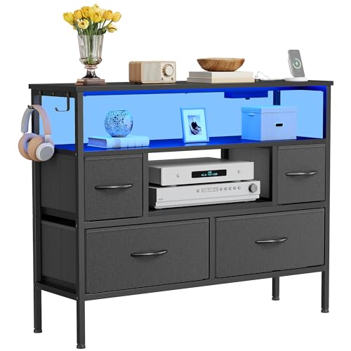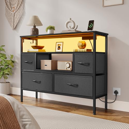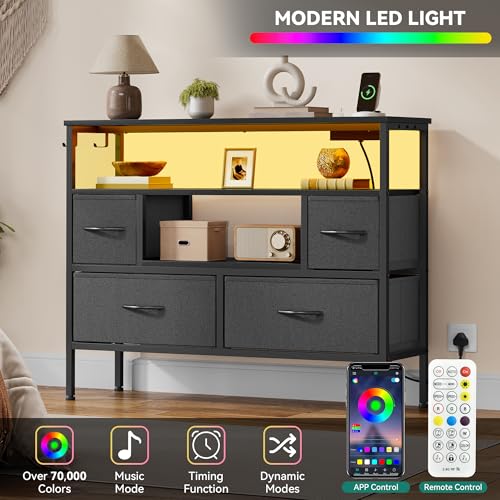YITAHOME Fabric Drawers Cabinet with Power Outlets & LED Lights, Fabric Chest with 4 Drawers & 2 Hooks, Fits TVs up to 32 Inches, Chest of Drawers for Bedroom, Living Room, Home Office, Dark Grey