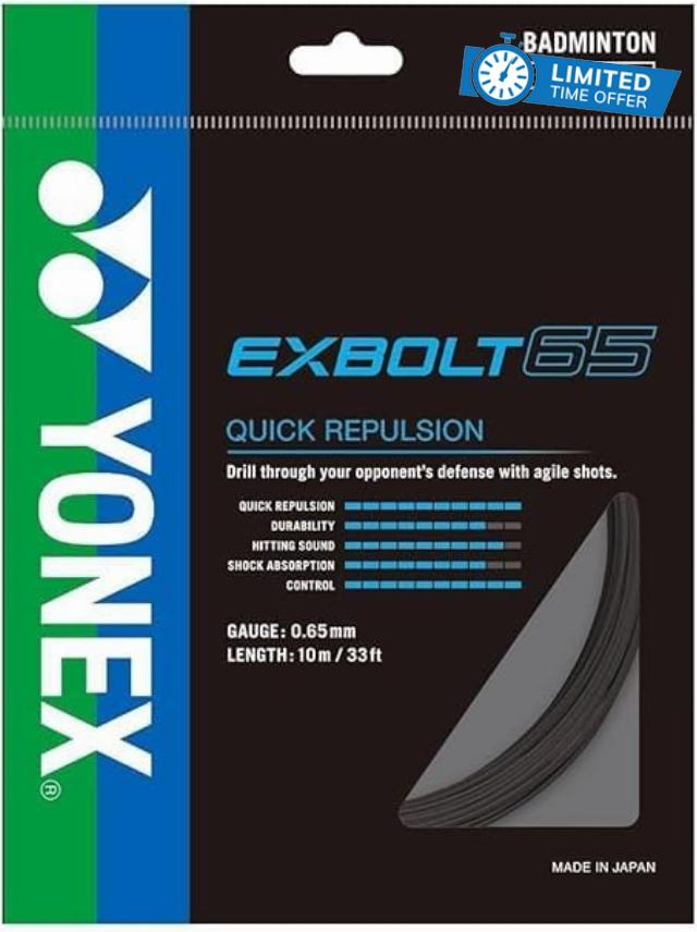 - If you've been searching for a thin string that doesn't compromise on durability, the EXBOLT 65 is your answer. It is designed to withstand high tension and the rigors of intense play while delivering a crisp feel and a satisfying hitting sound. Step up your game with the string that offers an accelerated shot and an instant bite on the shuttlecock.