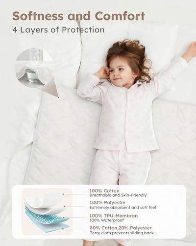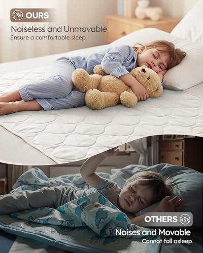 4 Layers of Protection: This bed wetting sheets is composed of a breathable and skin-friendly organic cotton outer layer, a soft polyester fiber filling layer, a noise-free and fully breathable TPU waterproof layer, and a non-slip bottom, dedicated to protecting kids sleep and showing care.