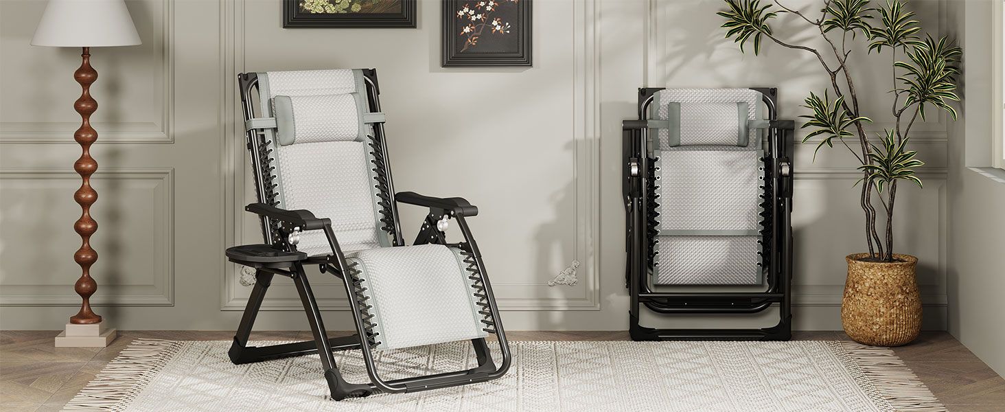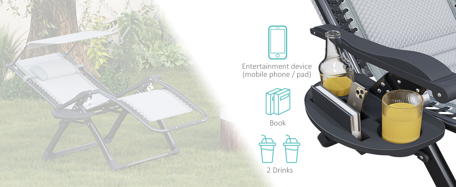 - Detachable Side Tray: Each folding lounge chair includes a multi-functional accessory tray, complete with two secure cupholders, a phone mount, and a dedicated tablet holder—keeping your essentials within easy reach