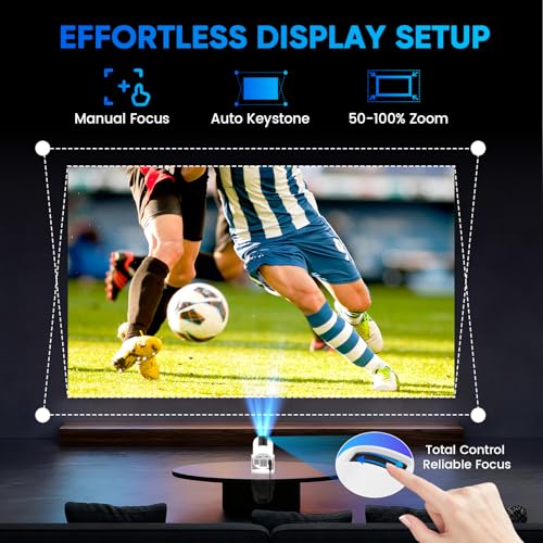 • 【Auto Keystone & Manual Focus】Achieve a flawless picture with minimal effort. This smart projector automatically corrects image distortion for a perfectly rectangular display, while the manual focus ring gives you pinpoint control over sharpness. Together, they ensure your viewing experience is always perfectly tailored to your space and content