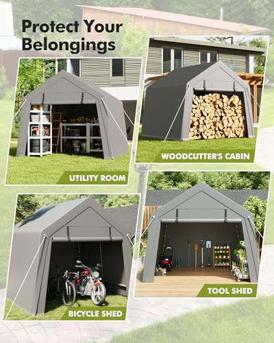 10×10 Outdoor Garden Storage Shed, Heavy Duty Outdoor Carport Canopy with Rolled Up Zipper Door, Waterproof Motorcycle Shelter, Portable Storage Tent for Bikes, Motorcycles, Garden Tools, Grey