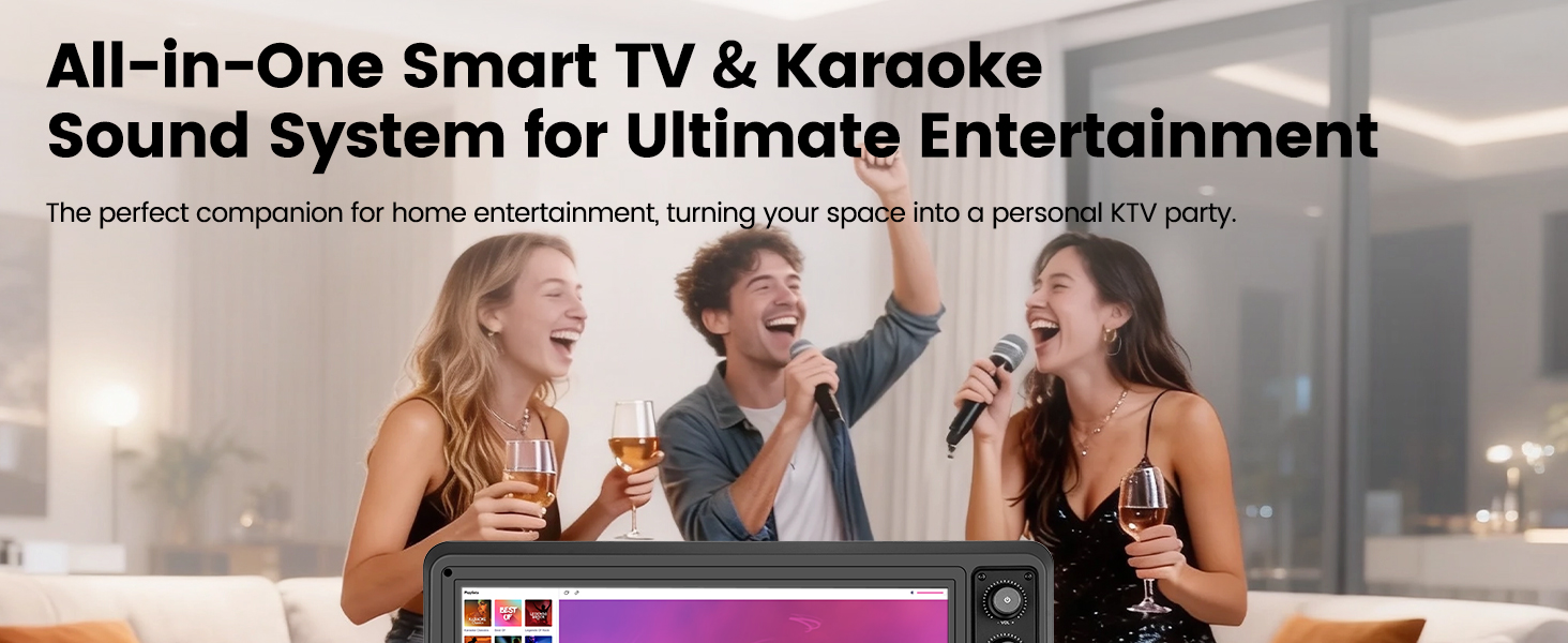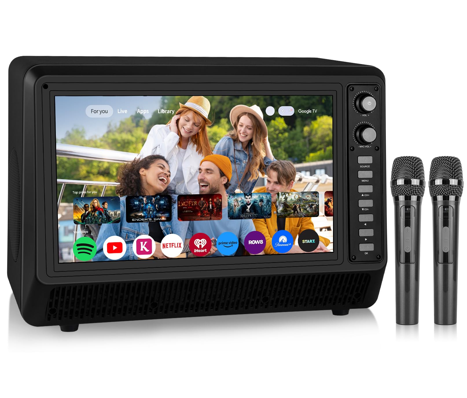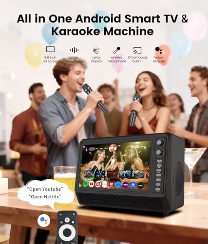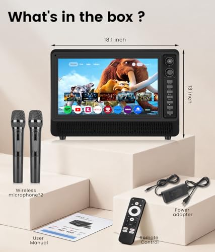 15.6 Inch Samll Smart TV,Built-in Dual Wireless Microphones,Bluetooth,HDMI/USB in,12V6A/24V4A in Portable Television for Bedroom,Kitchen,Gaming, and Karaoke Party