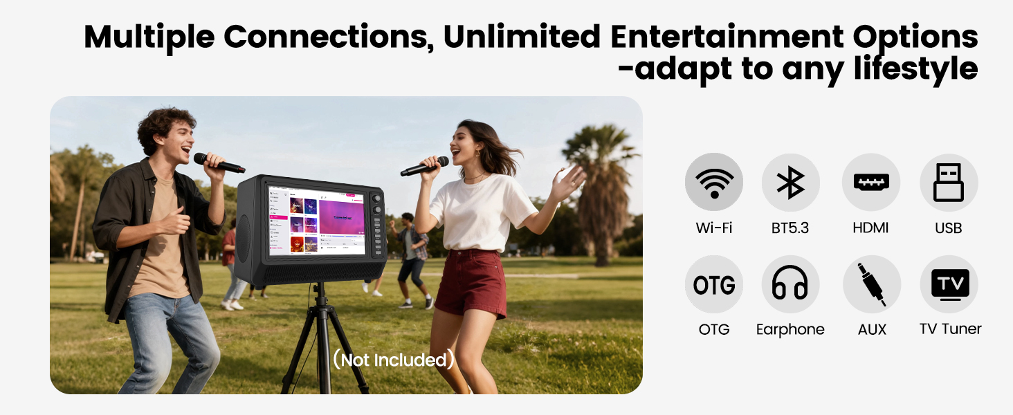 - Multiple Connectivity Options for Maximum Flexibility Connect your streaming sticks, gaming consoles, or external devices via HDMI, USB, or AUX. Includes an external T2 tuner to enjoy live Television anywhere—just plug and play! (Note: Not compatible cable services.)