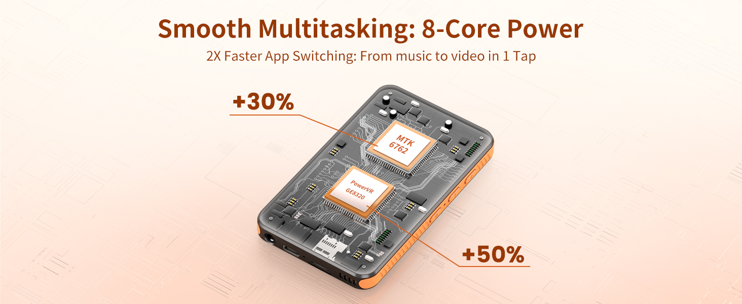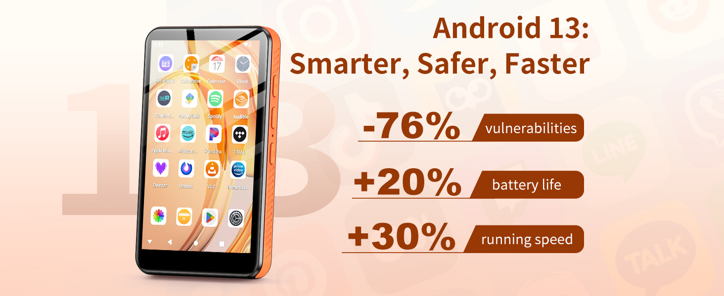 - 【Android 13 MP3 Music Player】The Android MP3 player powered by the Android 13 OS and MTK 8-core processor, you can enjoy a seamless user experience, access a vast collection of apps, provides a much better experience in interface personalization, control performance and battery life. Pre-installed with many of the most popular Apps, including Spotify, Omnia, Audible, Amazon music, Play store, FM Radio, etc.