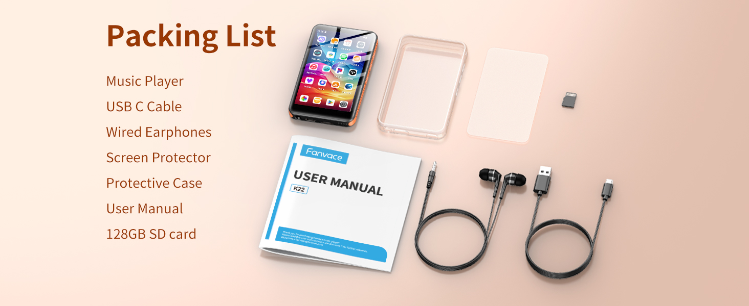 - 【Packaging】Our package included: 1 x MP3 Player , 1 x 128GB SD Card, 1 x USB Cable , 1 x Wired Earphones ,1 x Screen Protector , 1 x Protective Case , 1 x User Manual; Note: Please use 5V-1A or 5V-2A charger for power supply, please do not use fast charger.