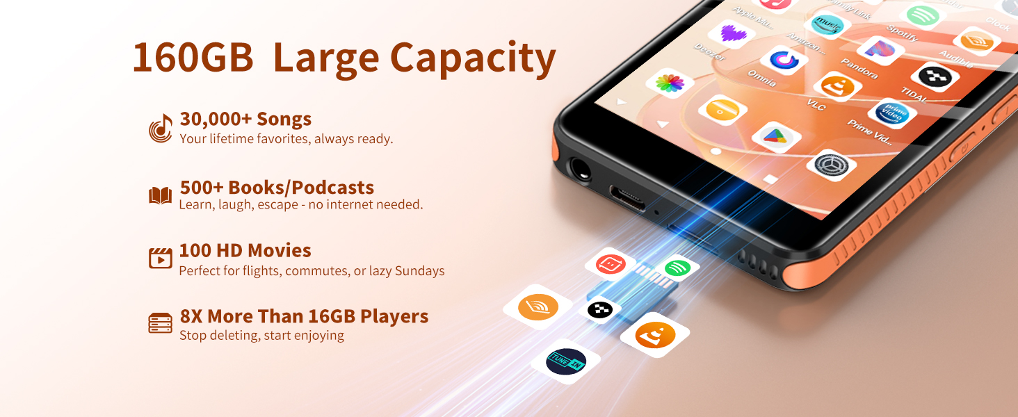 - 【160GB Large Storage】Spotify MP3 player built in 4GB RAM and 160GB storage(32GB ROM+ 128GB micro SD card), supports to expand external storage up to 512GB, which can easily hold thousands of music. Extra-large MP3 memory can greatly satisfy your need to store more songs, videos, audiobooks and pictures.