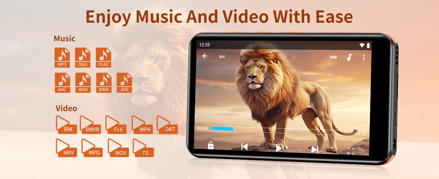 - 【MP4 Player with 4" IPS Touchscreen】Bluetooth MP4 player boasts a 4-inch HD touchscreen with exceptional screen resolution, which make every detail of your favorite movies, videos and photos will be brought to life with crystal clear clarity. Supports video formats as RM、RMVB、FLV、MP4、DAT、MKV、MPG、MOV、TS and so on, can be played directly without conversion, which bring you an unparalleled viewing experience.