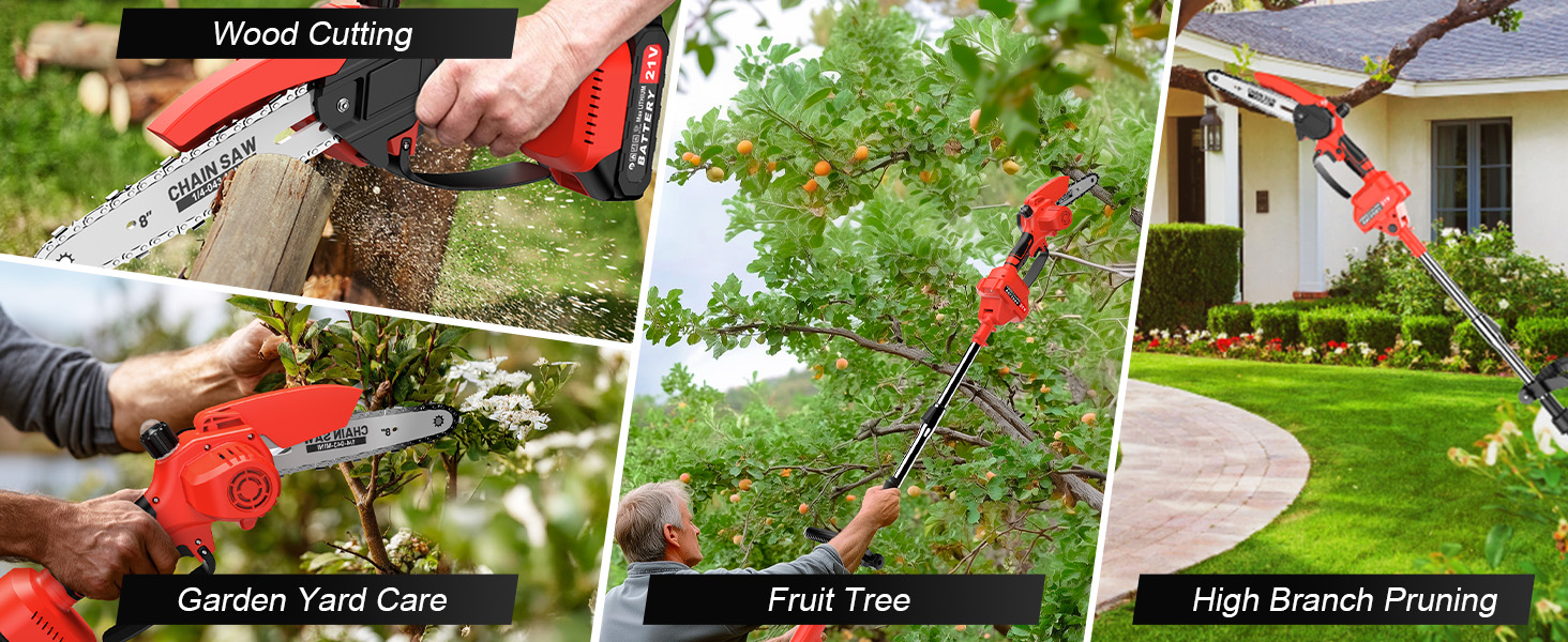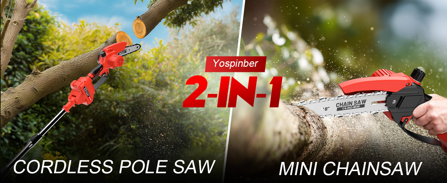 【2-in-1 Tool】This upgraded 2 in 1 cordless pole saw is based on the traditional mini chainsaw, equipped with a long retractable pole for trimming high branches with ease and precision, while mini chainsaw can be used for low-position work. It's ideal for cutting logs and trimming branches without the need for a big, heavy chainsaw, it meets various pruning needs for gardeners.