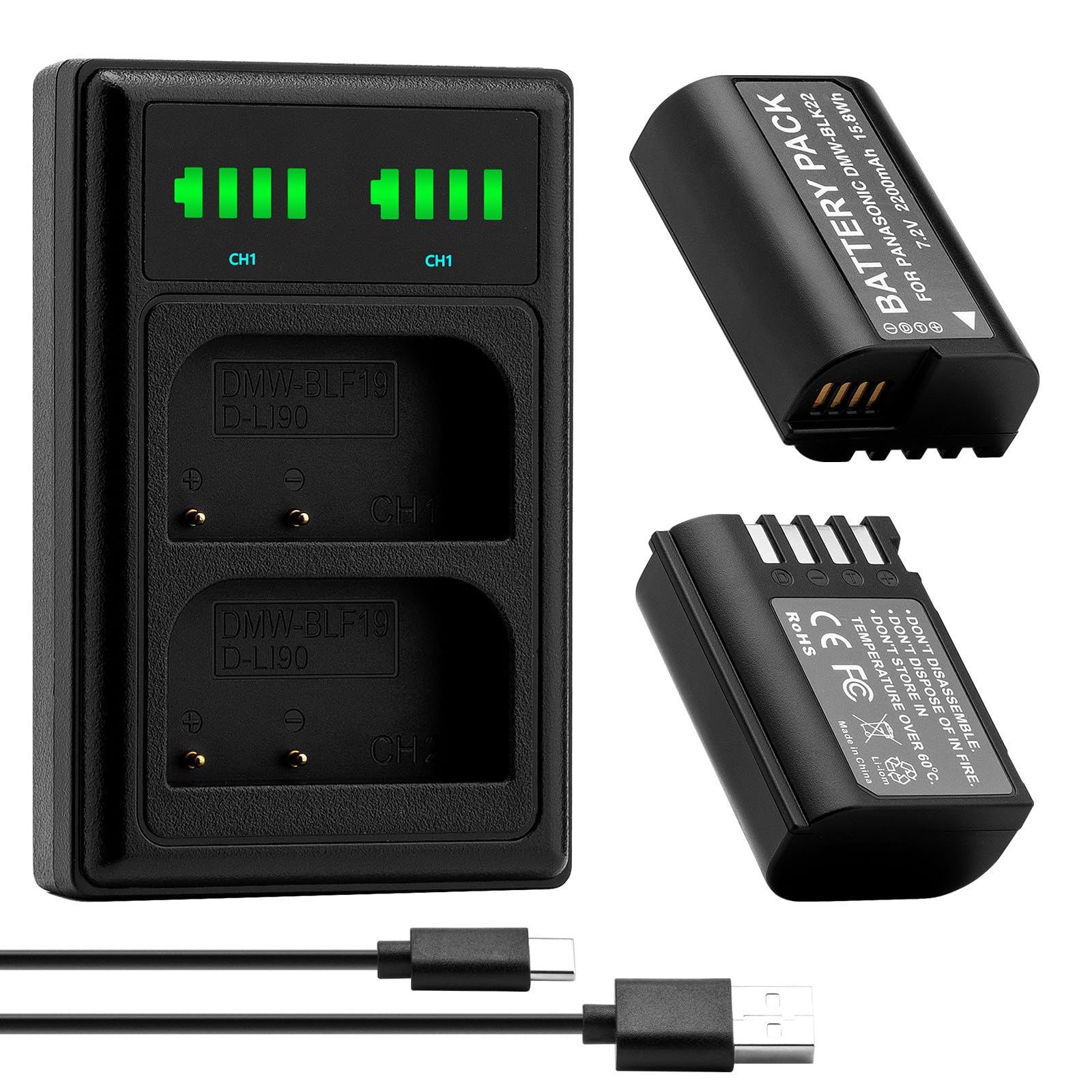 PACKAGE INCLUDES: 2 x DMW-BLK22 batteries + LED dual USB charger with type C port + micro cable; any quesitons, please contact us.