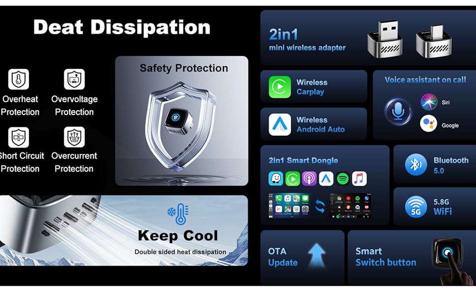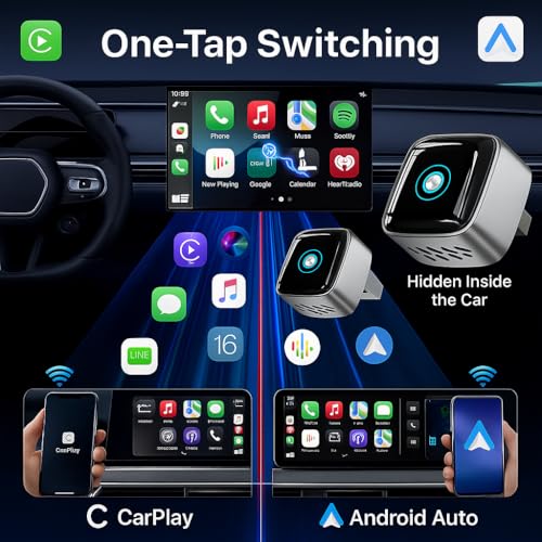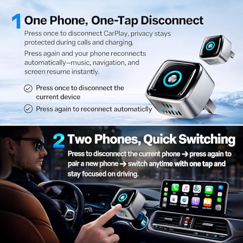 Bullet 1: 2026 Upgrade Wireless CarPlay Adapter UK & Android Auto Wireless Adapter: Features Dual-Device Memory and a physical One-Tap Switch, allowing two drivers (e.g., iPhone & Android users) to toggle devices without repeated pairing. IMPORTANT: Switching protocols involves a system handshake that takes 20–30 seconds. This is normal logic for data stability—please wait patiently and DO NOT unplug during this loading phase.
