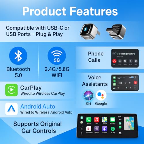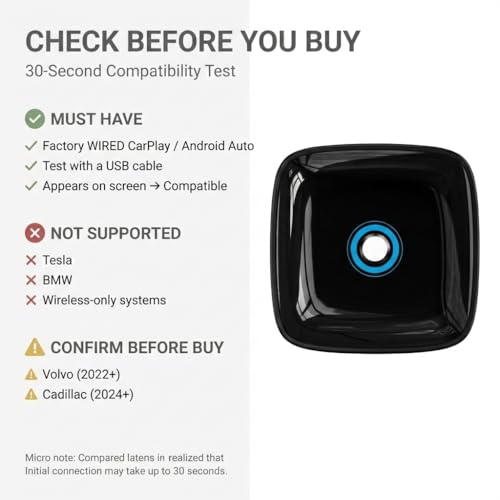 Bullet 2: Pre-Purchase Compatibility Check (Must Read): Designed strictly for vehicles with Factory Wired CarPlay or Android Auto (2016+). Simply plug into the USB/USB-C port to convert wired CarPlay or Android Auto to wireless. ⚠️ NOT COMPATIBLE with BMW, Tesla, or cars that already have wireless-only systems. Does not support aftermarket Android head units. (Volvo 2022+ / Cadillac users: please confirm protocol support before buying).