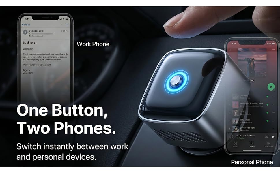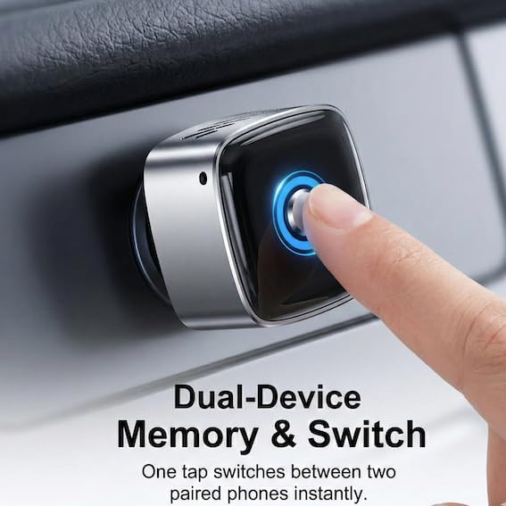 Bullet 5:Ideal for Families & Shared Vehicles: With the unique One-Tap Quick Switching button, you can move between work and personal phones or swap usage between co-drivers easily. No need to navigate complicated car menus to disconnect one phone and pair another—just press the button to switch memory slots.