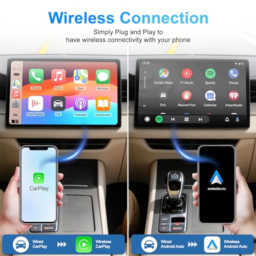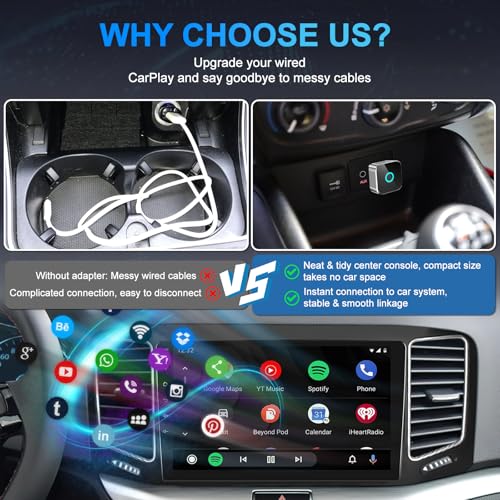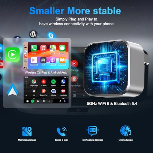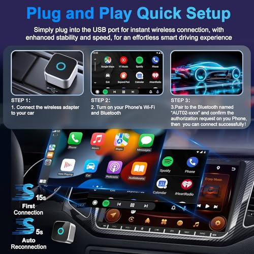 【High-Speed Connectivity】Dual-band technology for faster transmission: Some adapters utilize 2.4GHz + 5GHz dual-band technology, increasing transmission speed by 100%, delivering a smooth navigation, music, and call experience. Supports high-definition audio/video synchronization, eliminating stuttering or delays while driving, meeting the needs of daily commutes or long trips. Even on bumpy roads or in areas with signal interference, it maintains a stable wireless connection, preventing disconnections from affecting the driving experience.