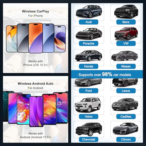 【Wide Compatibility】This 2-in-1 wireless CarPlay adapter is compatible with iPhone (iOS 10+) and Android (Android 11+), meeting the needs of families with multiple devices. It is also compatible with 98% of original CarPlay models, and is suitable for almost all vehicles equipped with original wired CarPlay or Android Auto, including USB-A and USB-C interfaces. Whether you're commuting daily or traveling long distances, the wireless CarPlay adapter adds convenience and enjoyment to your driving experience.